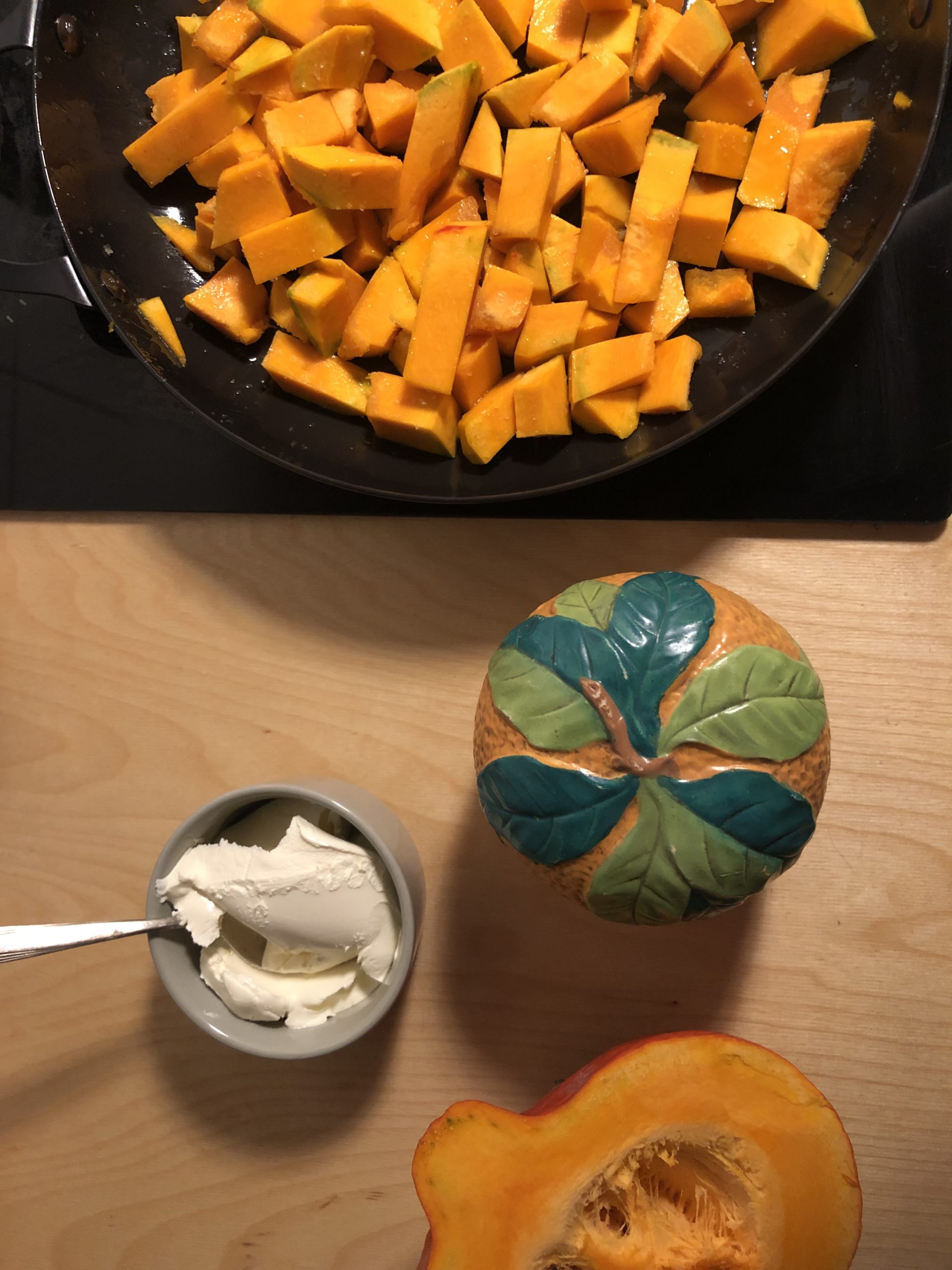 Den Kürbis in einer heißen, hohen Pfanne scharf anrösten (ca. 5-10 Minuten unter regelmäßigem Schwenken). Nach wenigen Minuten Cayennepfeffer hinzugeben und mitrösten, anschließend den geriebenen Ingwer hinzufügen und warten, bis die Ecken des Kürbisses leicht bräunlich werden. Alles mit Brühe oder Weißwein ablöschen − ich habe den alkoholfreien Weißwein von Kolonne Null benutzt − die Hitze drosseln und den Kürbis-Sud für kurze Zeit sich selbst überlassen. Das Nudelwasser zum Kochen bringen und auf Hitze gebracht ordentlich salzen. Sobald der Kürbis gar ist und sich leicht zerdrücken lässt, jedoch noch nicht in sich zerfallen ist, die Nudeln ins Wasser geben und nach Packungsanweisung kochen (nicht vergessen, einen Becher Nudelwasser aufzuheben). Nun den Knoblauch fein reiben und zur Kürbis-Pfanne hinzugeben. Anschließend den Kürbis mit einem Kartoffelstampfer oder Kochlöffel zerkleinern, bis eine breiige Masse entsteht. Ich lasse hier und da größere Stückchen über, ganz fein funktioniert aber natürlich auch. Jetzt die Mascapone hinzugeben. Wenn die Masse zu trocken wirkt, einen großen Schluck des aufgehobenen Nudelwassers hinzufügen und die Sauce bei niedriger Hitze simmern lassen und nach Bedarf mit Nudelwasser verflüssigen. Wenn die Nudeln kurz vor al dente sind, abgießen und mit der Sauce vermischen. Den letzten Schluck Nudelwasser und Parmesan untermischen. Mit Extra-Parmesan oder Cayenne gut schmecken lassen.