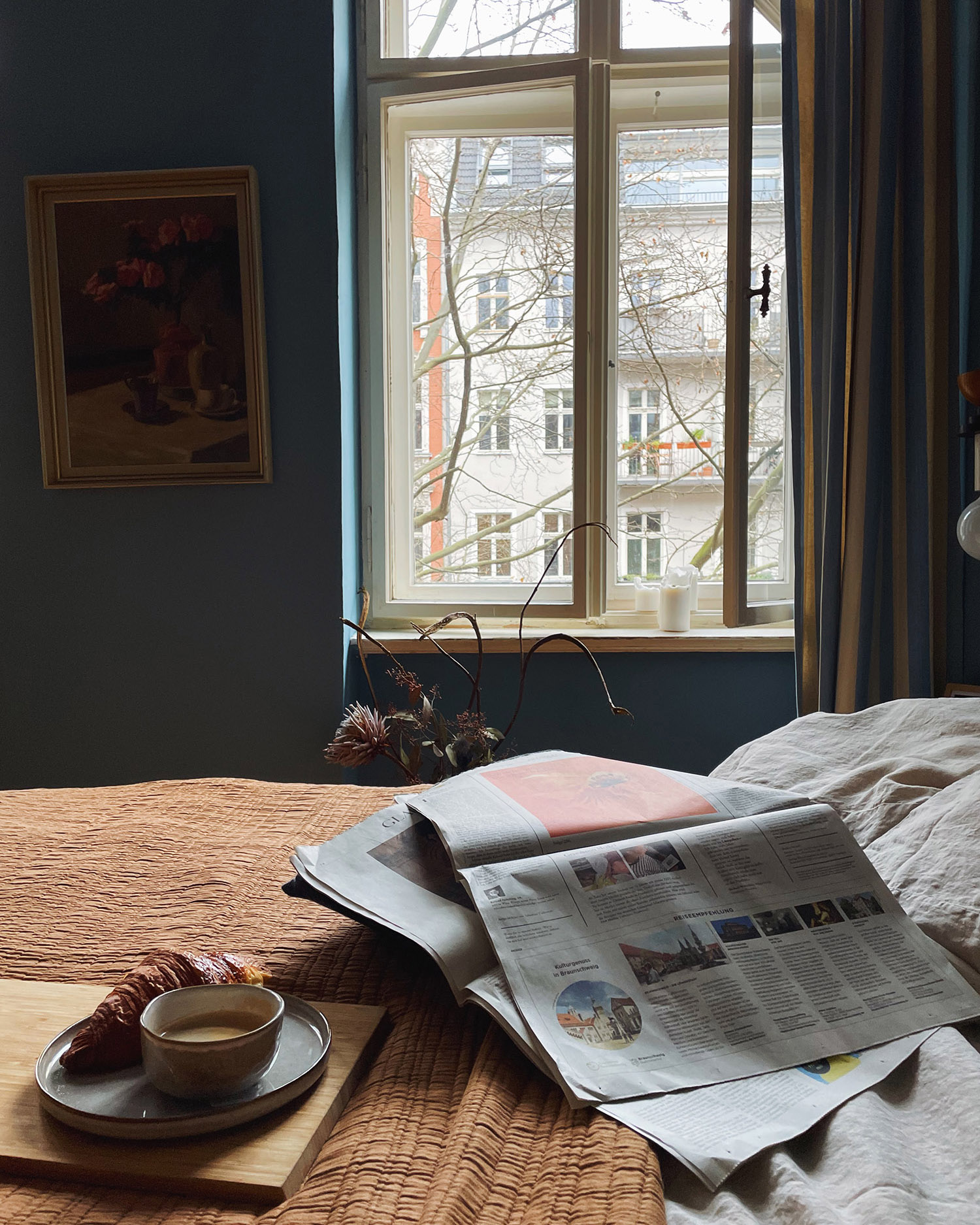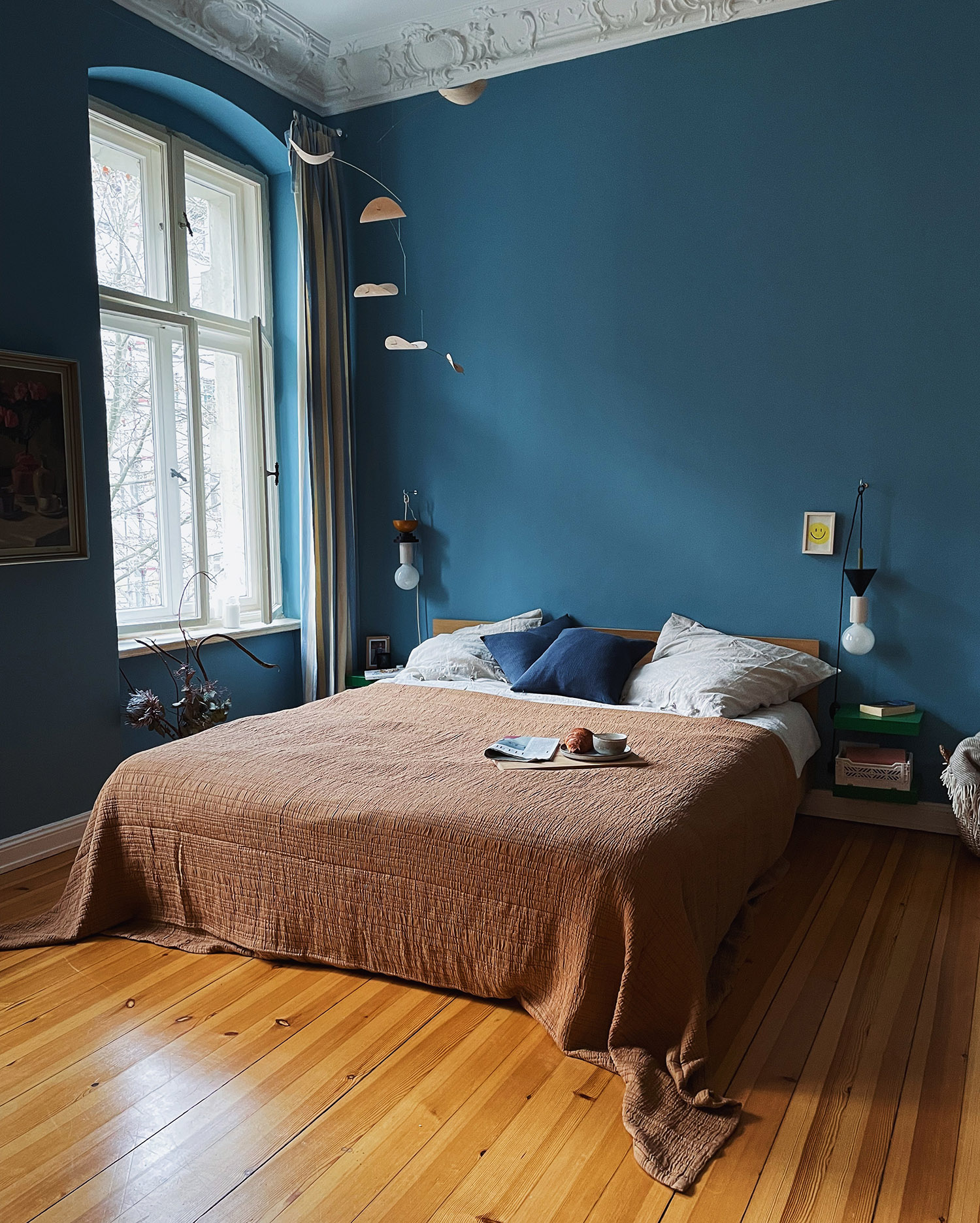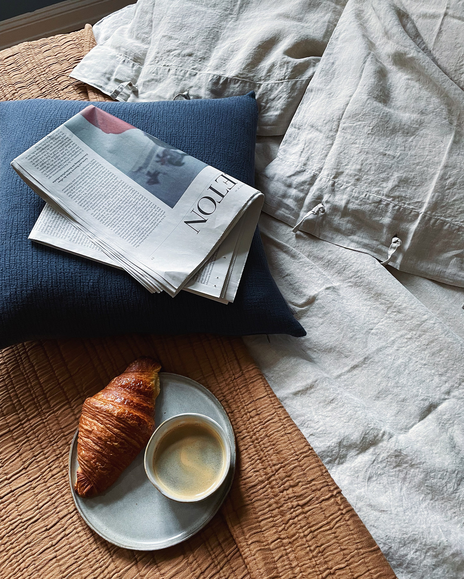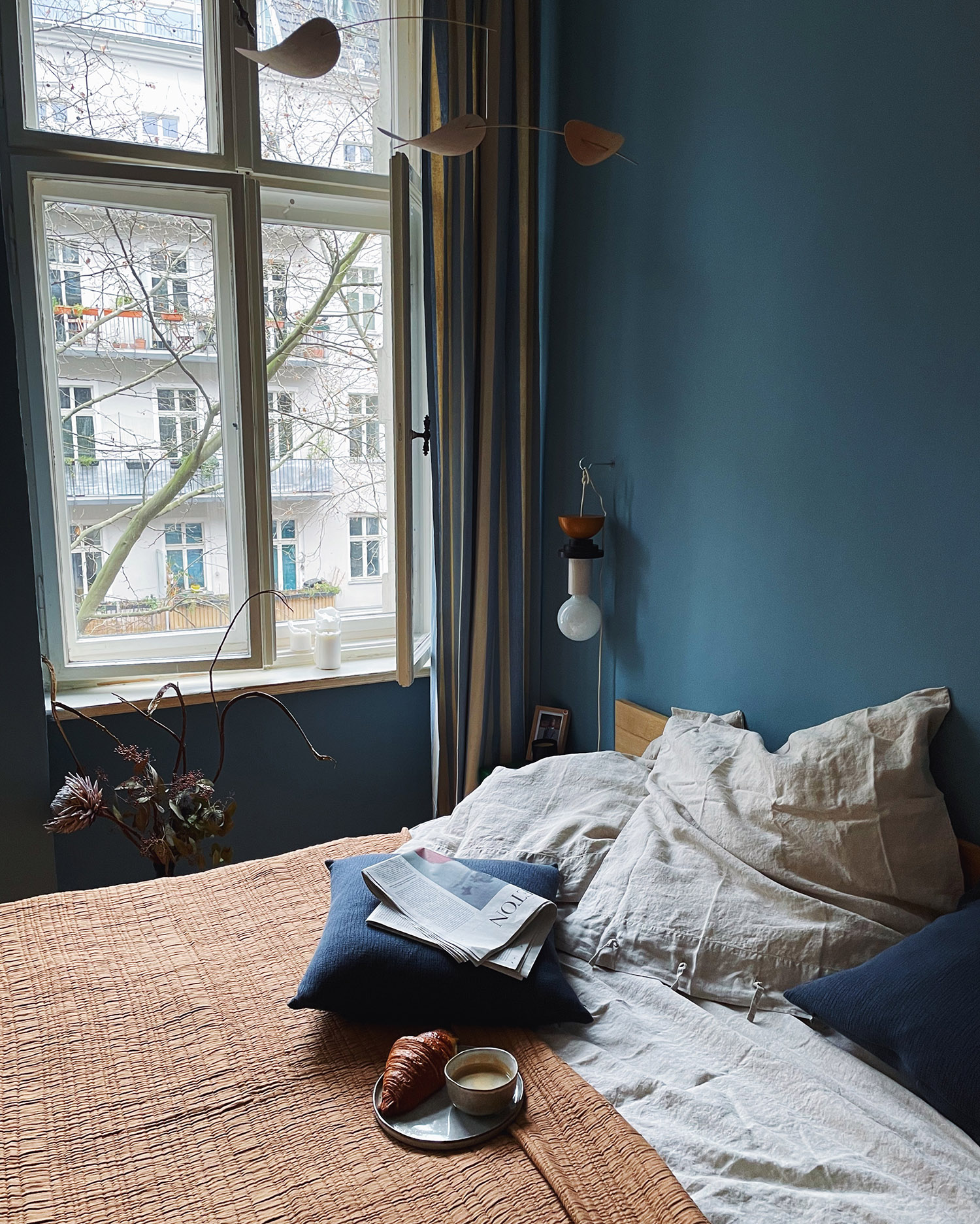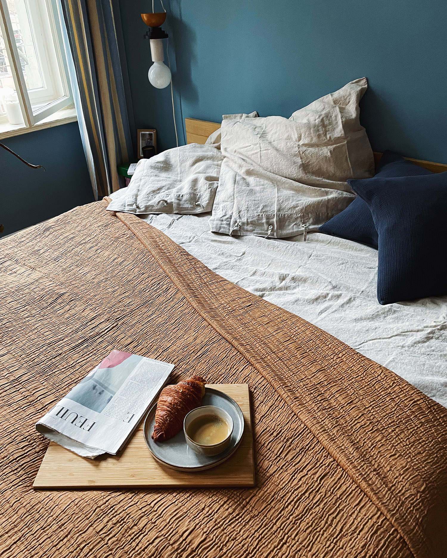 Die Farbpalette der Produkte dieses nachhaltigen Online Stores ist selbstverständlich von der Natur inspiriert und steht für eine saisonunabhängige, ausgewogene Ästhetik. Und dafür greift URBANARA auf natürliche Prozesse zurück und bietet beispielsweise ausgewählte Decken und Kissen an, die ihre Farbe Resten aus der Lebensmittelindustrie zu verdanken haben. So entstehen wunderschöne Naturfarben, die zugleich die Umwelt schonen. Und all das macht vor allem im Schlafzimmer Sinn: An einem Ort, der uns in erster Linie Ruhe schenken darf, unsere Akkus wieder auflädt und in dem wir uns möglichst entspannen sollen – und ein Ort, an dem es so wichtig ist, dass wir umgeben von natürlichen Materialien und ohne schädliche Giftstoff aus Herstellungsprozessen schlafen. Warme, erdige Brauntöne treffen bei mir also nun auf ein kälteres Blau, der perfekt zum Schlafen geeignet ist. Und was soll ich sagen? Ich lieb’s!