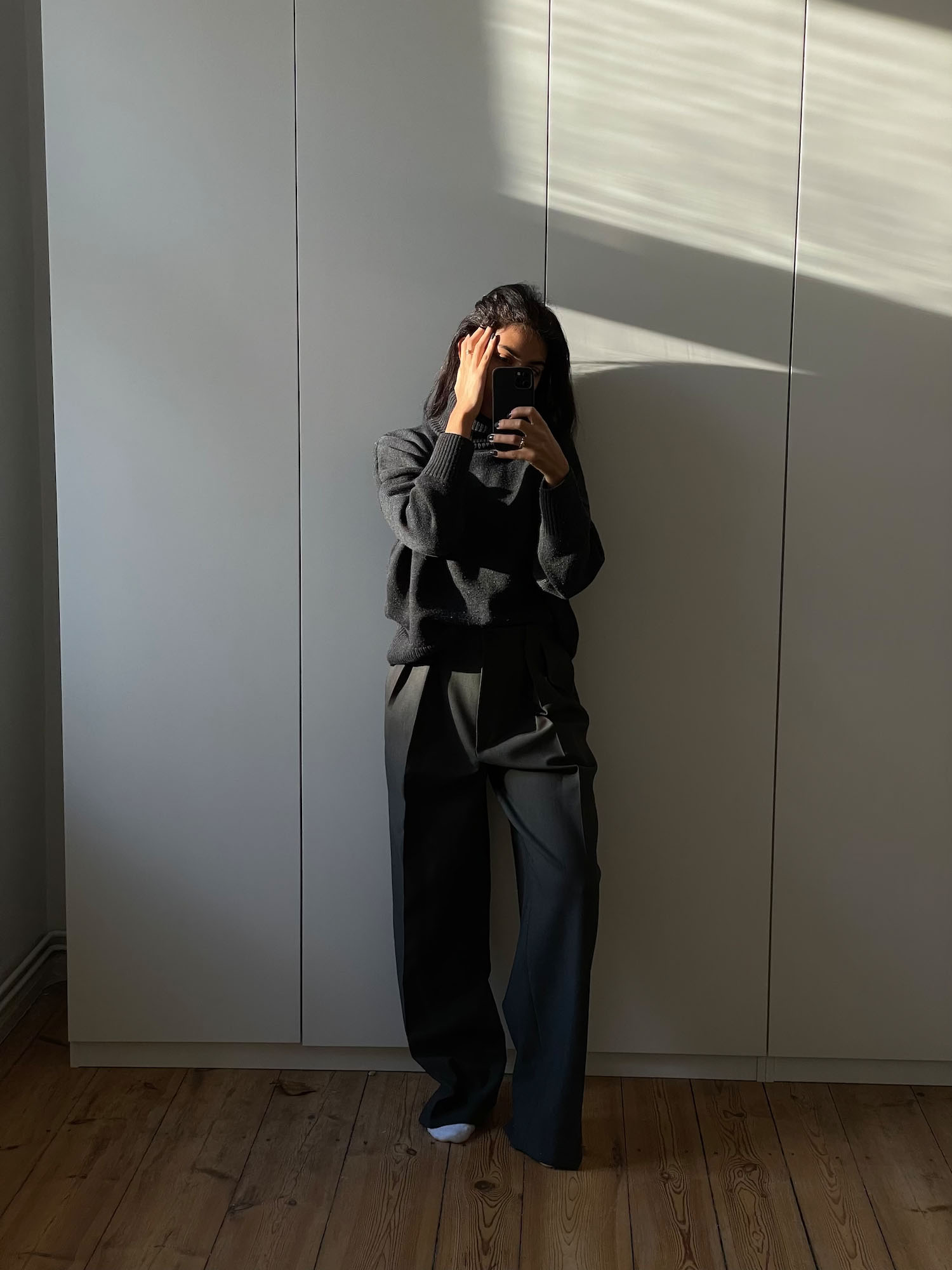 Am wohlsten fühle ich mich in einem tollen Strickpullover, wie der hier von Rhea, und in einer gut sitzenden Anzughose. Im Sale habe ich mir diese Hose von the Row gegönnt, sie ist genau das, wonach ich gesucht hatte. Dazu trage ich super gerne Sneaker und im Sommer immer FlipFlops.