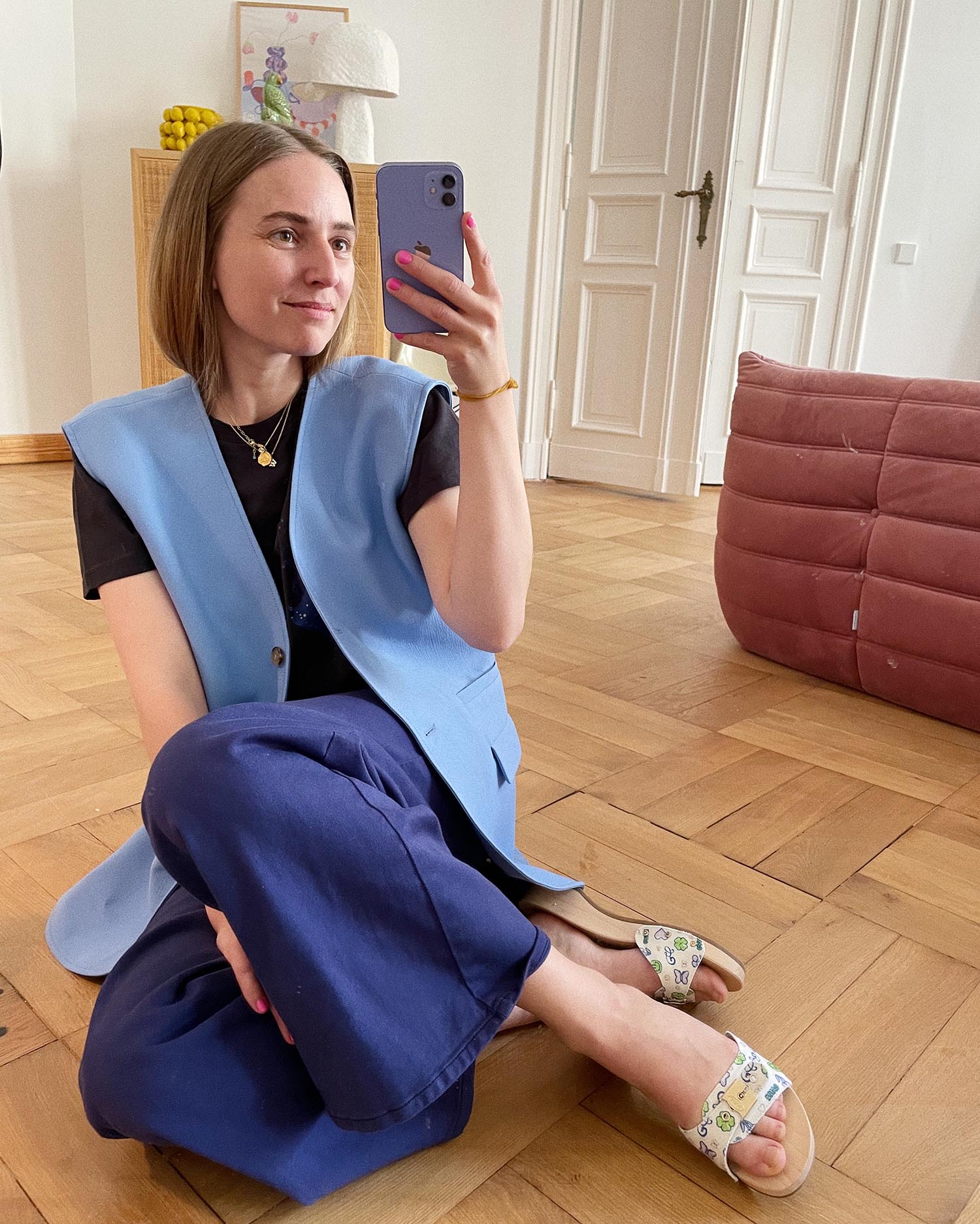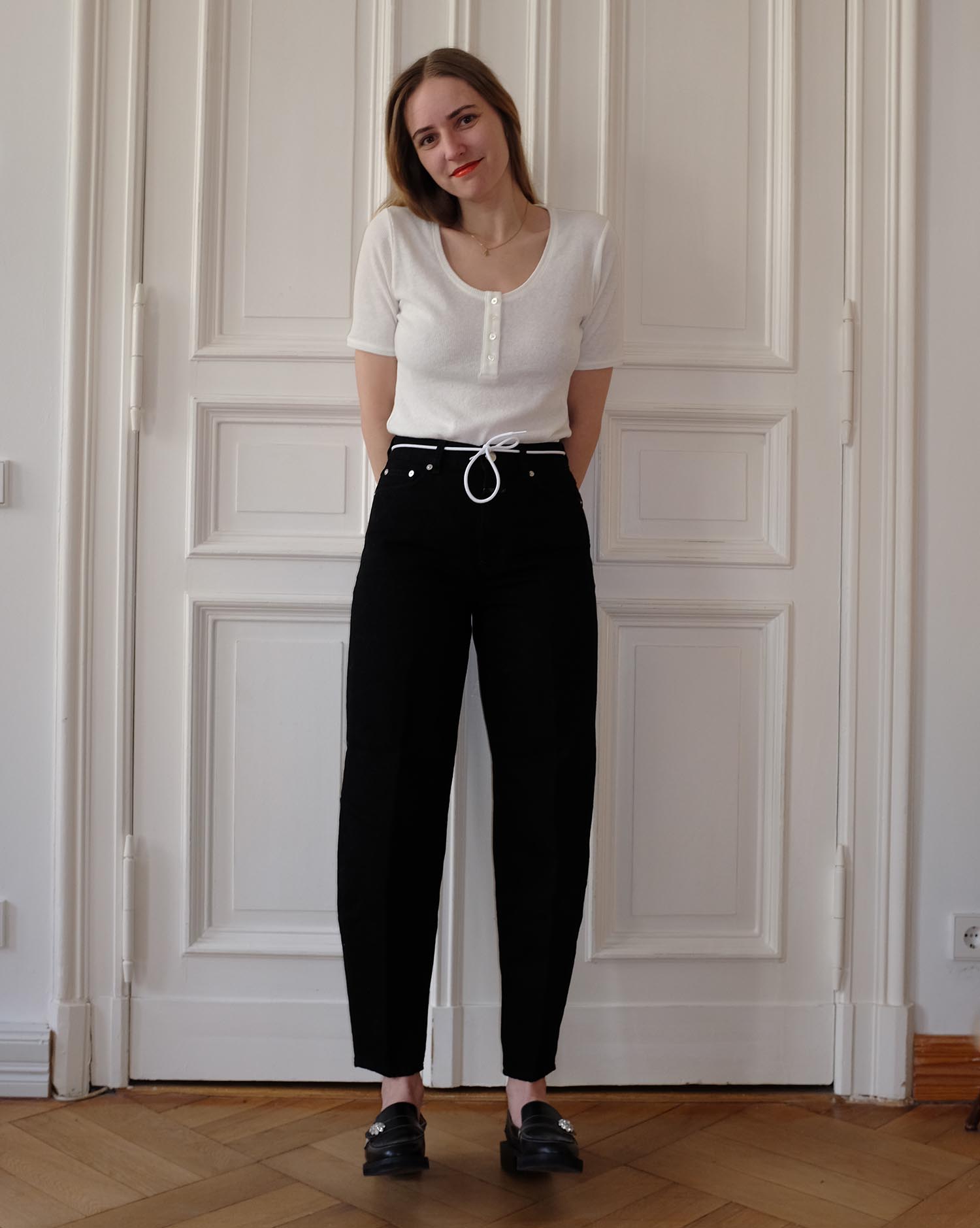 Shirt: Ganni (alt, ähnlich hier), Weste: Stine Goya, Jeans: Baum + Pferdgarten, Schuhe: Ganni x Scholl