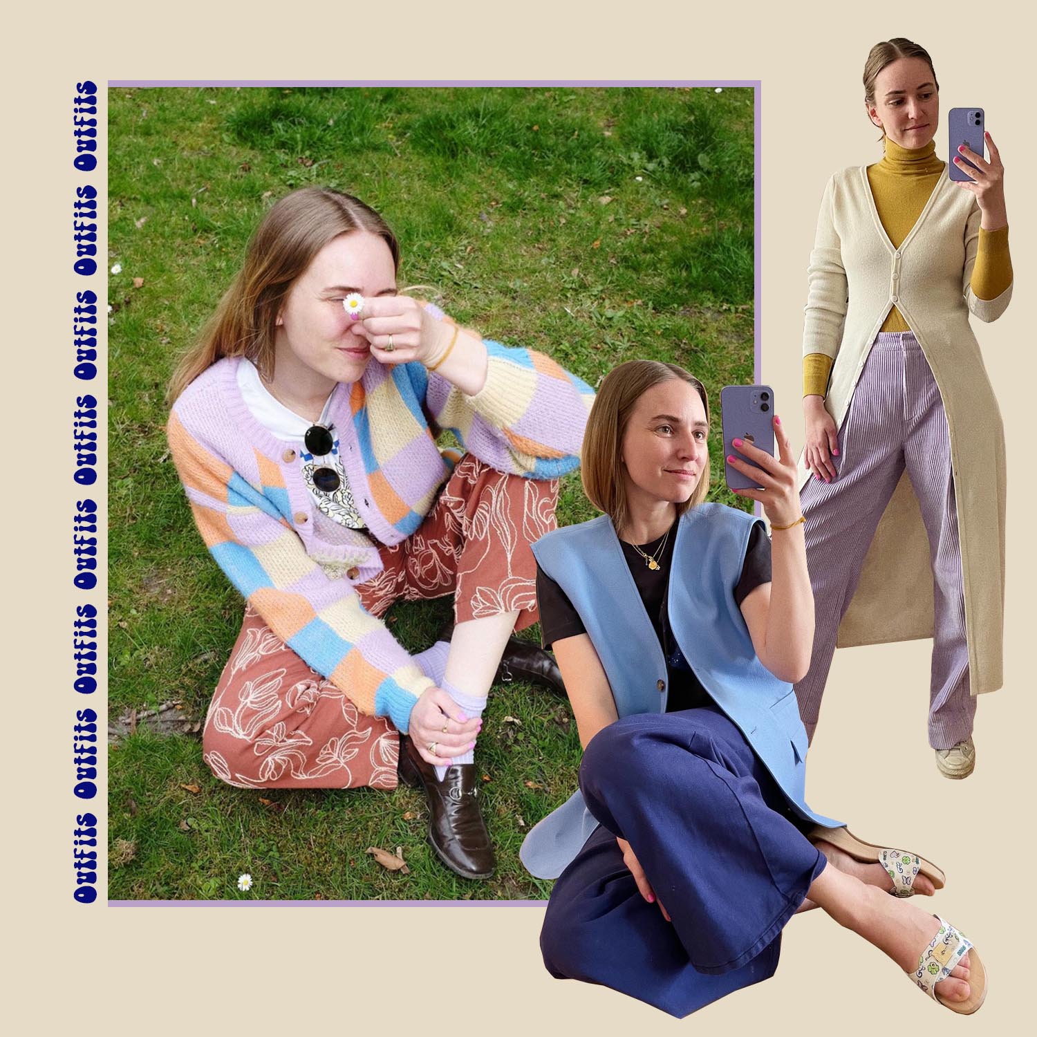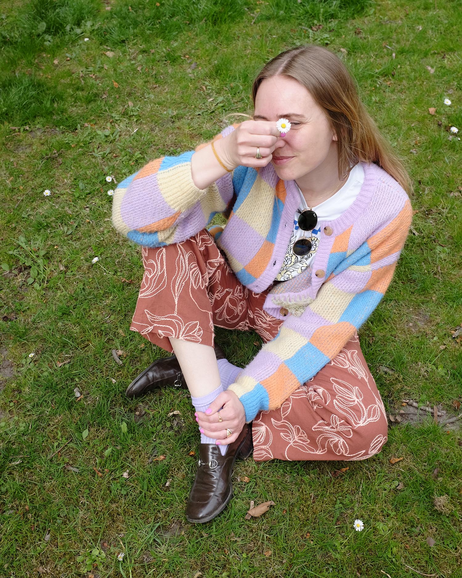 Shirt: Ganni (älter, ähnlich hier), Cardigan: Stine Goya, Hose: Stine Goya, Schuhe: Gucci 2nd Hand, Socken: Popeia, Sonnenbrille: Ray-Ban