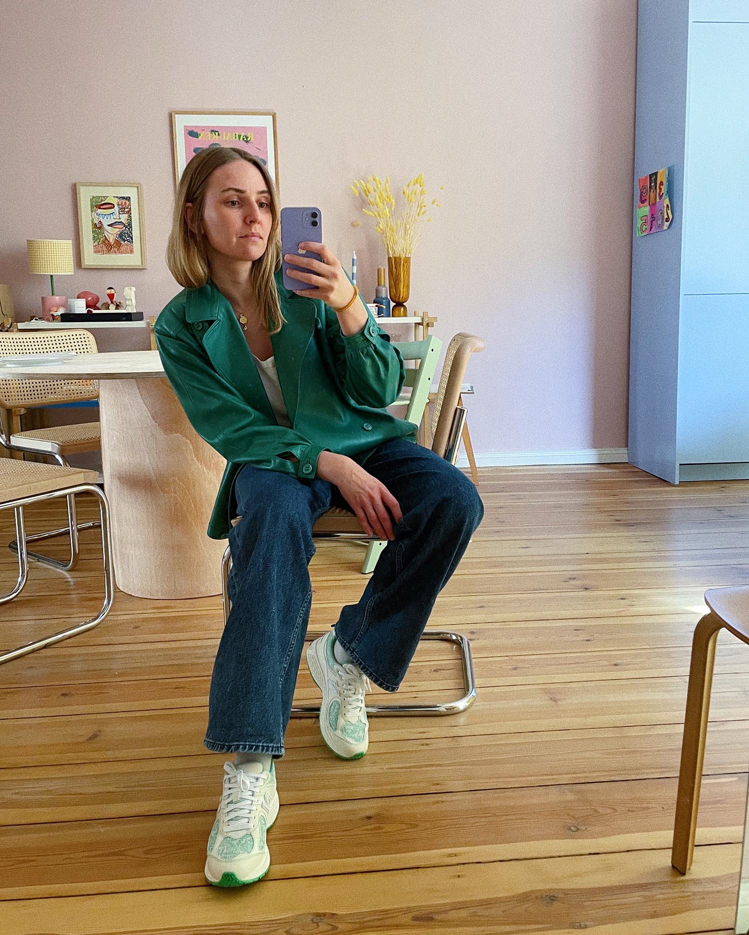 Lederjacke: Loewe 2nd Hand, Shirt: Closed, Schuhe: Ganni x New Balance