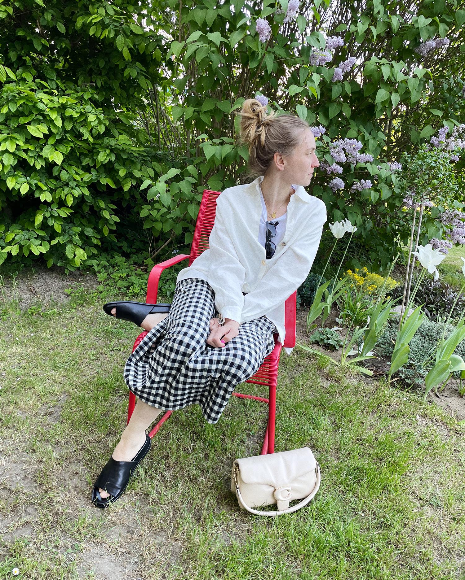 Shirt: Lacoste (alt), Bluse: & Other Stories (älter, ähnliche hier), Rock: Edited, Sonnenbrille: VIU, Schuhe: Aeyde, Tasche: Coach