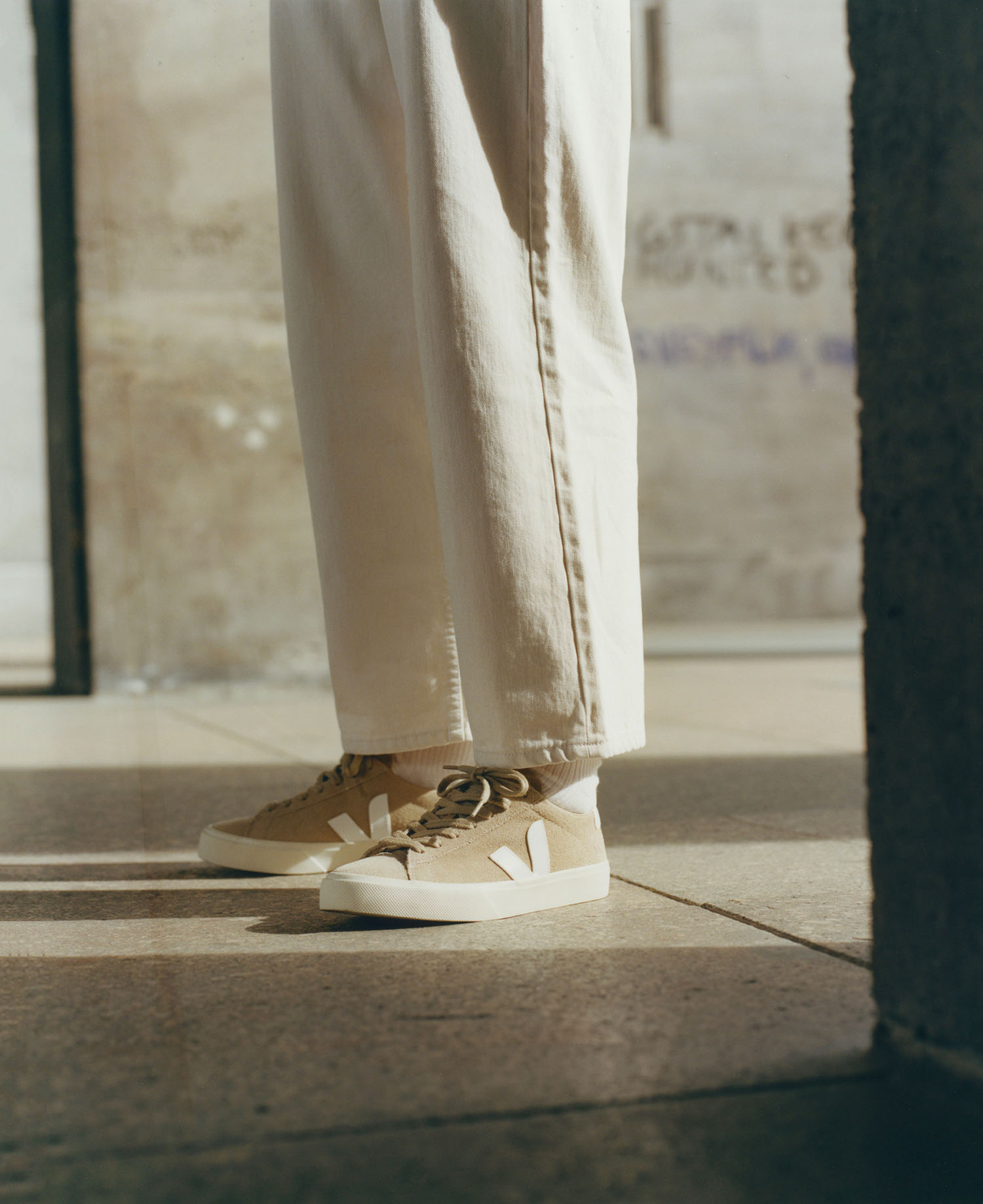 Für die Gestaltung des Stores wählte VEJA die Zusammenarbeit mit dem Berliner Architekturbüro Gonzalez Haase. Und genau die haben mit Rohmaterialien gearbeitet: Beton, Eiche, Stahl und Erde. Die Inspiration für diese 100 Quadratmeter liegt im minimalistischen Design Berlins, das bereits in den VEJA-Stores in Paris, Bordeaux und New York zu finden ist. Die Schuhregale sind aus Stampflehm gefertigt, einem Gemisch aus Erde und Beton. Dieses Material wurde von Frank Lennart, einem deutschen Handwerker, entworfen.