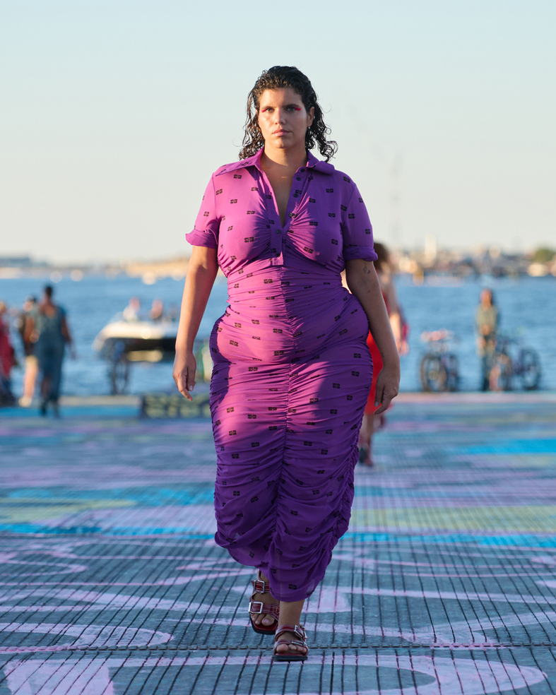 „Meine besten Ideen kommen mir morgens auf dem Fahrrad. Ich setze meine Kopfhörer auf, drehe die Musik super laut und fahre zur Arbeit. Diese 15 Minuten gehören ganz mir. Es ist ein einzigartiges Gefühl, im Sommer in der Stadt zu sein: Die Energie pulsiert, sie bringt deinen Herzschlag in Schwung. Das hat uns dazu gebracht, über den Rhythmus unseres Herzens, den man auf einem Krankenhausmonitor sieht, nachzudenken. Diese Linie ist so schön – sie ist das Leben. Wir haben diese Lebenslinie als Symbol für die gesamte Kollektion verwendet, mit wellenförmigen Linien auf Kragen und Saum, die vom Herzschlag inspiriert sind.“ – Ditte Reffstrup, Kreativdirektorin GANNI