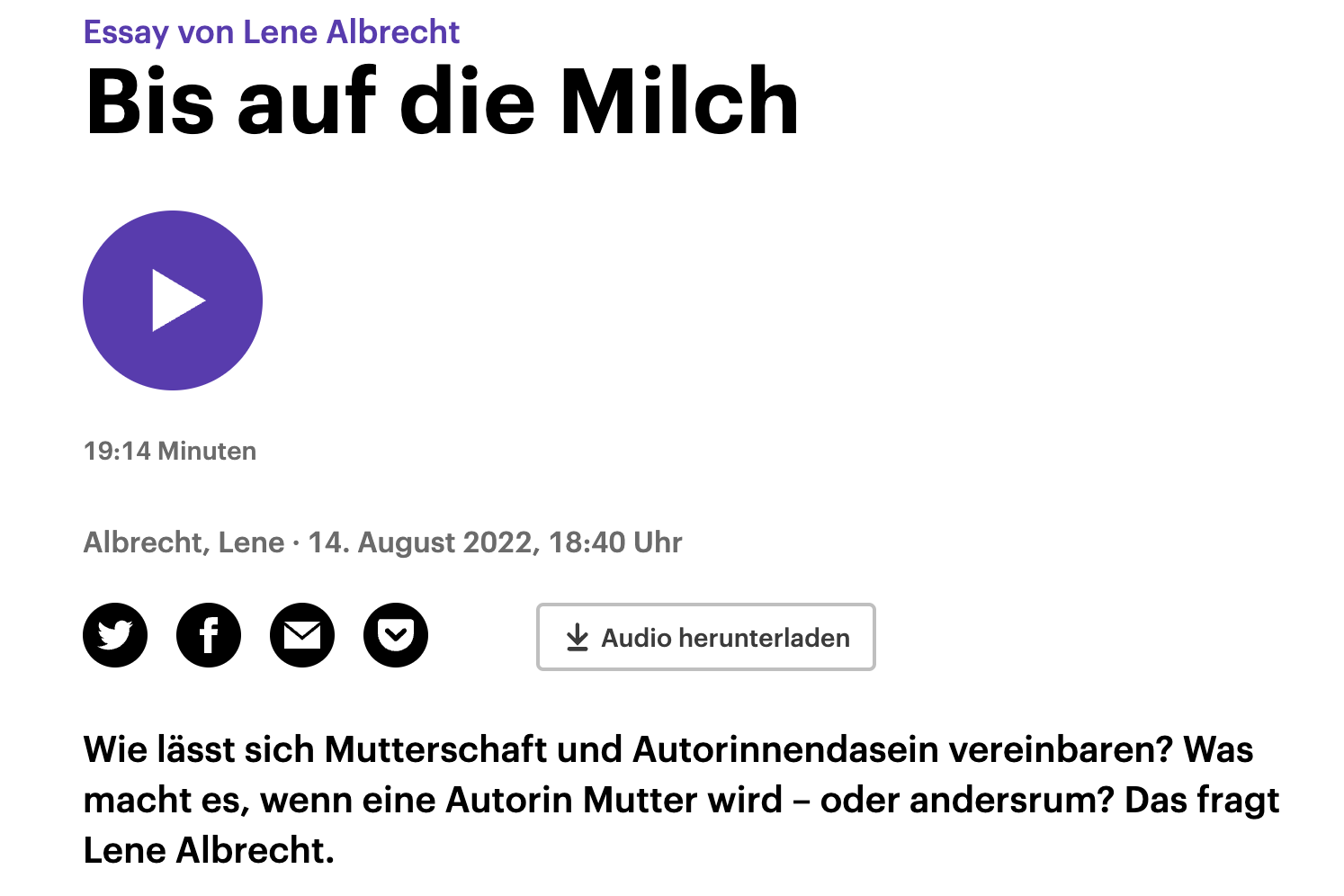 Aber vorher noch schnell ein kleiner Tipp, den mir Paulina Czienskowski gegeben hat: Im Essay „Bis auf die Milch“ spricht Lene Albrecht über schreibende Mütter, jetzt wurde er für Deutschlandfunkkultur eingelesen. Vielleicht habe ich während des Hörens geweint – auf die gute Weise.