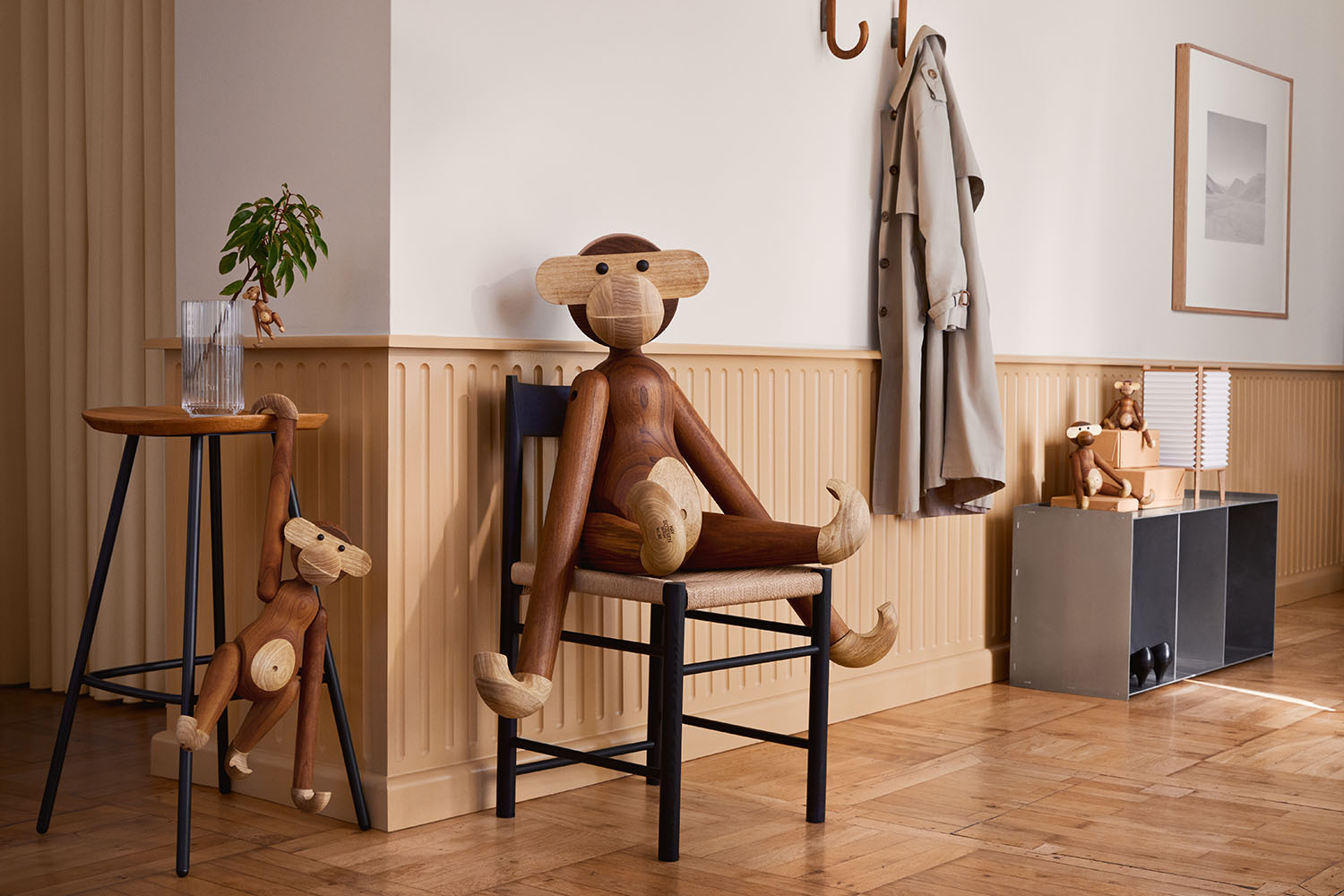 Die Form der XXL-Tiere der Reihe Kay Bojesen Masterpieces orientiert sich an den Originalfiguren aus dem Archiv sowie an den übergroßen Abmessungen, die Kay Bojesen selbst sowohl für den Elefanten als auch für den Affen verwendet hat. Letztere entwarf er Ende der 1950er-Jahre auf Bestellung als auffällige Landmarken für ein Geschäft für angewandte Kunst und genau dieser skulpturale Blickfang steht im Mittelpunkt der modernen Versionen der großen Meisterwerke, die die bekannten Figuren als exklusive Designobjekte und Kunstwerke aus Holz im Einklang mit anderen großen Möbelklassikern aus dem Bücherregal hinunter auf den Boden holen. Die Preise haben es bei dieser Größe allerdings auch in sich und fangen bei 12000 Euro an. Nunja, dann bleibe ich wohl doch eher bei der Miniatur-Version.