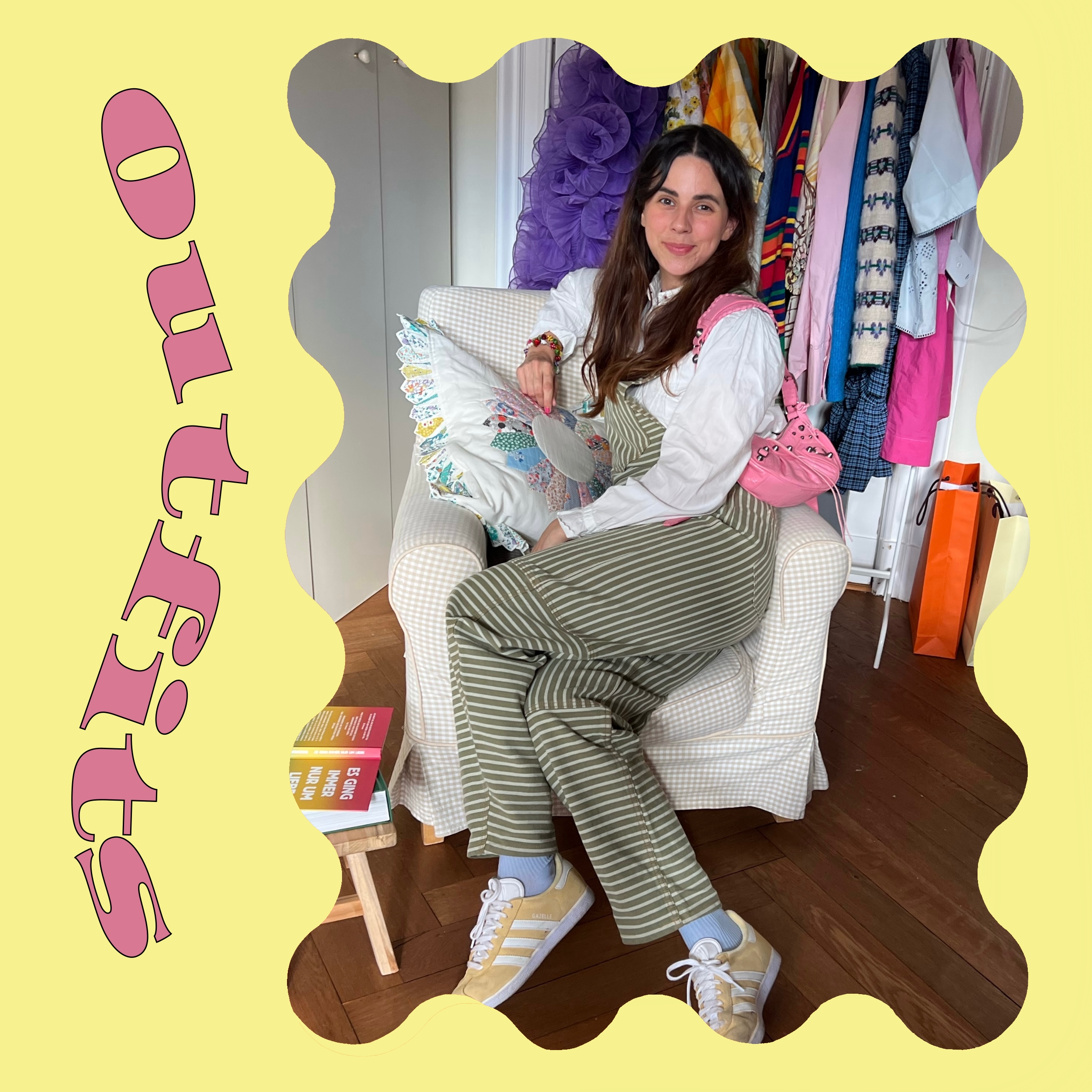 Bluse: Rouje, Latzhose: Ganni, Schuhe: Adidas Gazelle,