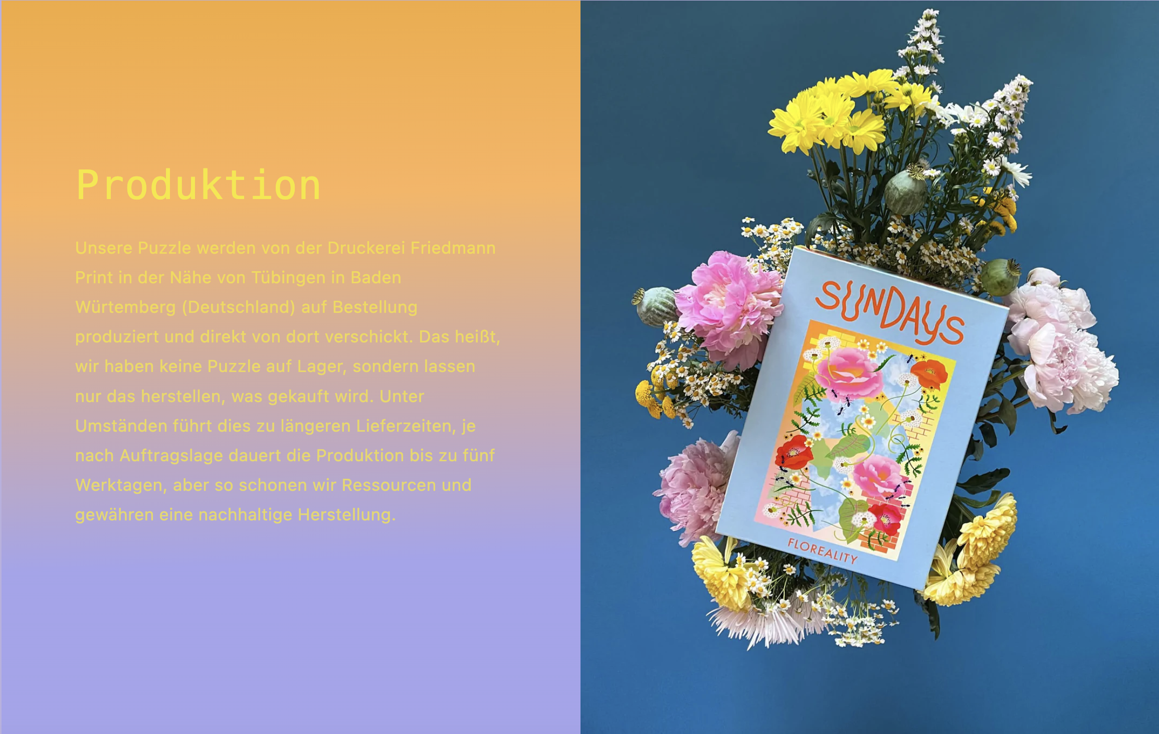 “Mit Sundays wollen wir Puzzle machen, die wir lieben. Weil sie aufregend und entspannend zugleich sind. Weil sie uns visuell stimulieren und uns zugleich beruhigen, weil uns die Suche nach dem nächsten passenden Teil erst fesselt und dann, wenn wir es finden, ganz selig macht. Egal an welchem Tag.”