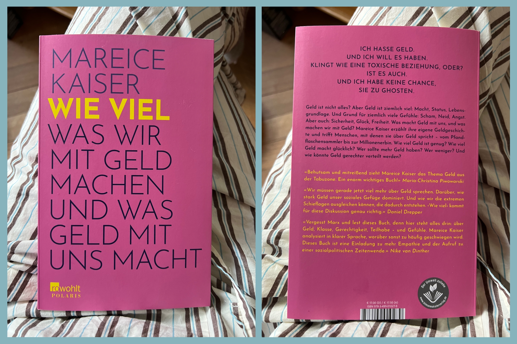Ich bin heute ganz besonders stolz auf Mareice Kaiser, die wirklich absolut keinen Grund hat, an sich zu zweifeln. Ihr erinnert euch vielleicht an „Das Unwohlsein der modernen Mutter“, ein Buch, das ich euch in einer älteren Kolumne wärmstens ans Herz legte. Nun erscheint „Wie viel – Was wir mit Geld machen und was Geld mit uns macht“. Ich durfte es nicht nur schon vorab lesen, sondern hatte zudem die große Ehre, ein Blurb für den Buchrücken zu verfassen. Und darum geht es: