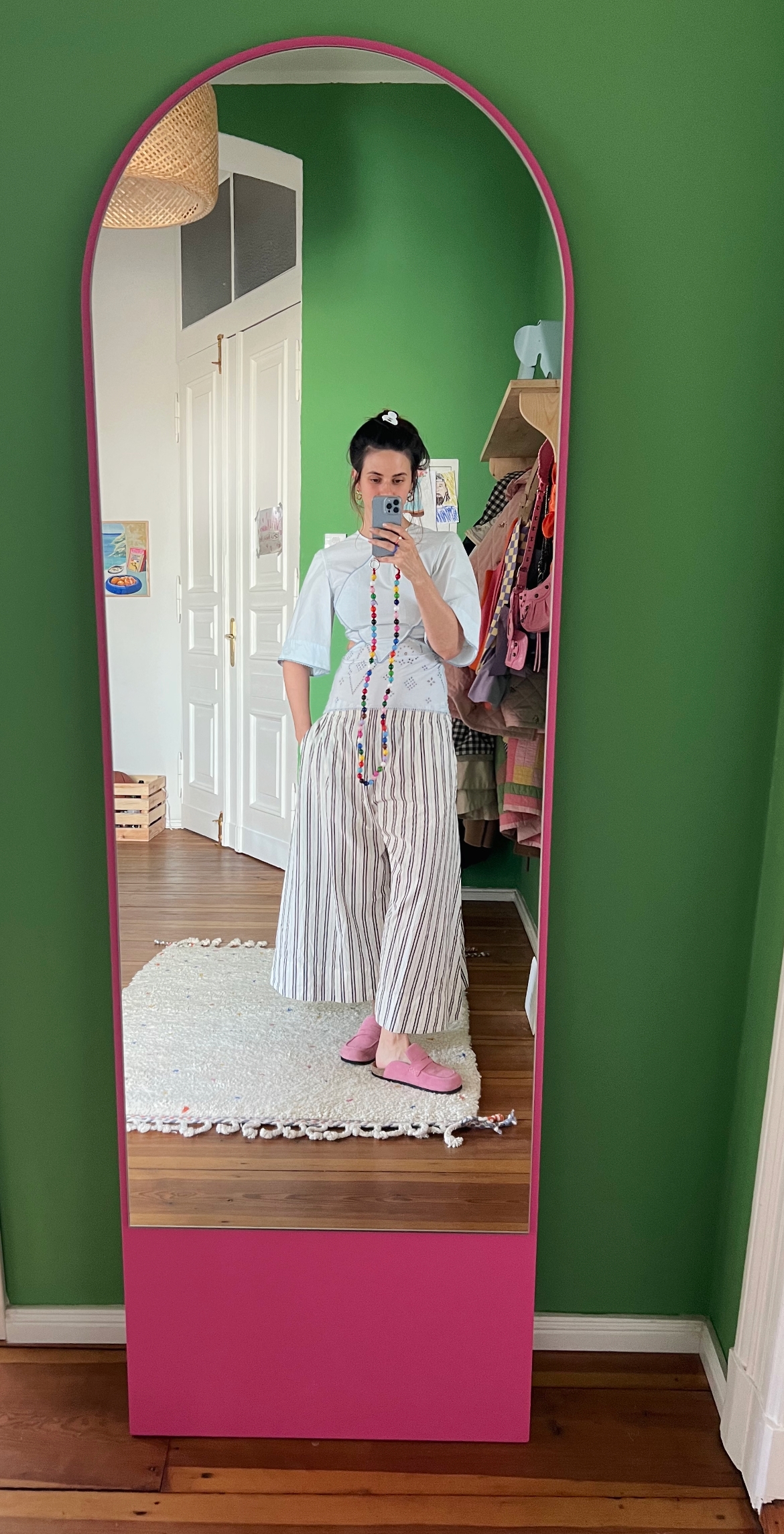 Habt ihr eigentlich schon Sarahs wundervolles Flur Makeover gesehen? Ich bin fast vom Hocker geflogen, so ordentlich, gemütlich und warm finde ich das Ergebnis. Dass ich jemals einen vergleichbar „erwachsenen“ Eingangsbereich haben werde, wage ich zu bezweifeln, was auch daran liegt, dass ich wahnsinnig schlecht darin bin, irgendetwas zu planen. Meistens fällt bei uns zuhause alles mehr oder weniger zufällig zusammen. So kam es auch, dass ich spontan entschied, dass dieses Emerald Green von Farrow & Ball so schön ist, dass es unbedingt bei uns einziehen sollte, ob es nun passt oder nicht. Seither beißt es sich im Flur mit dem Grün des Sofas nebenan, aber was soll’s. Vor ein paar Tagen trudelte dann Friedrich, auf den ich lange gewartet hatte, ein. Er steht jetzt im Flur, statt im Wohnzimmer. Vermutlich bekomme ich in ein paar Wochen ohnehin wieder die Krise, räume alles um und gelobe, fortan nur noch Beige, Weiß oder Holz anzuschaffen. Die Therapeutin einer Freundin erklärte neulich übrigens: Das Umstellen und Rumräumen macht man häufig, um die Kontrolle zu behalten, wenn ringsherum mal wieder Chaos herrscht. Nagut, klingt logisch. Hier entlang gehts zum Spiegel von Objekte unserer Tage.