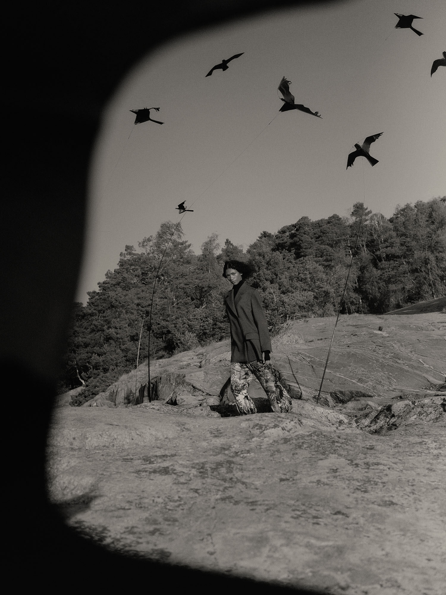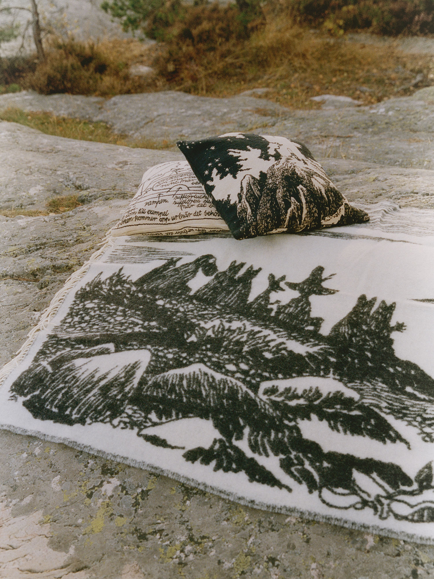 Ein schwarz-weißer, von Hand gezeichneter Print zeigt das verwunschene Muminland im Norden Finnlands: Karge Felsen und Bäume, Krähen fliegen über den Himmel und mitten drin Mumin und seine Familie. Ab dem 10. November bei ARKET erhältlich!
