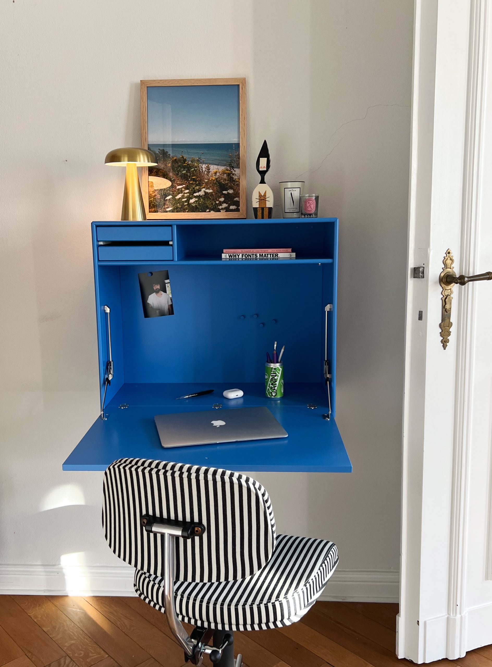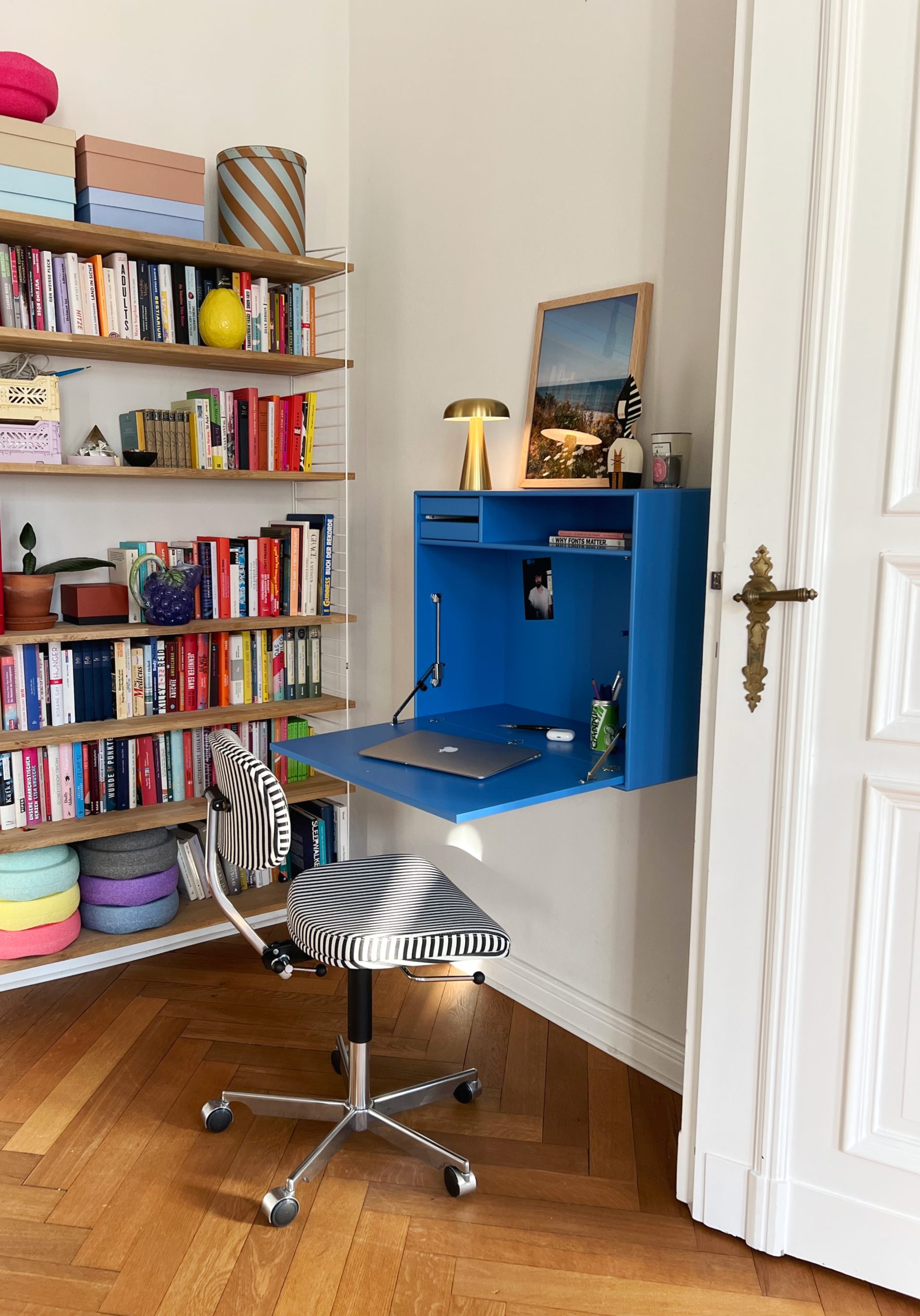 Es ist spät während ich diese Zeilen tippe, weil es das meistens ist, seit wir zu viert sind. Diese Stunden ganz allein vor meinem Bildschirm saugen mich gelegentlich aus wie all die gleich gespritzten Lippen ihre armen Austern. Dann gehe ich wie ein zusammen geknüddeltes Stück Papier ins Bett, ganz leer und müde. An anderen Tagen sind diese Stunden unendlich heilsam. Weil endlich Zeit zum Arbeiten, Denken und Machen bleibt, Zeit nicht nur für mich, aber mit mir allein. Wegen zu viel Gedankenbrei aufgrund von zu viel Firlefanz um mich herum, habe ich meinen großen Schreibtisch mittlerweile weitergereicht und es mir in einer kleinen Ecke neben einem der Bücherregale gemütlich gemacht. Die Freude auf die Dämmerstunden ist deshalb gerade doppelt groß. Auf diesem Handy-Schnappschuss seht ihr aber nicht nur den STUDIO Sekretär im Farbton Azure, den mir Montana zur Verfügung gestellt hat, sondern außerdem eine Fotografie von Marlen Mueller.