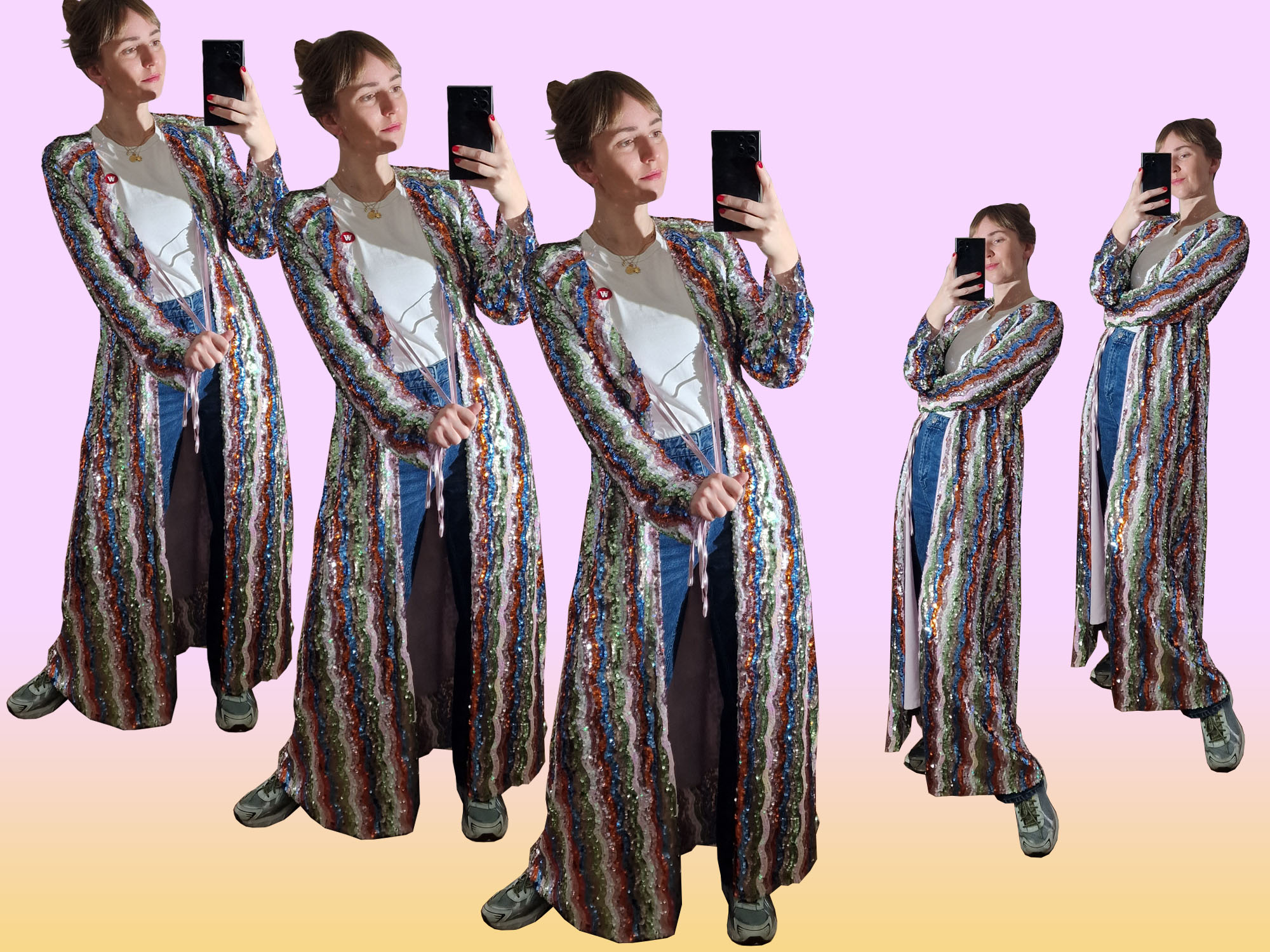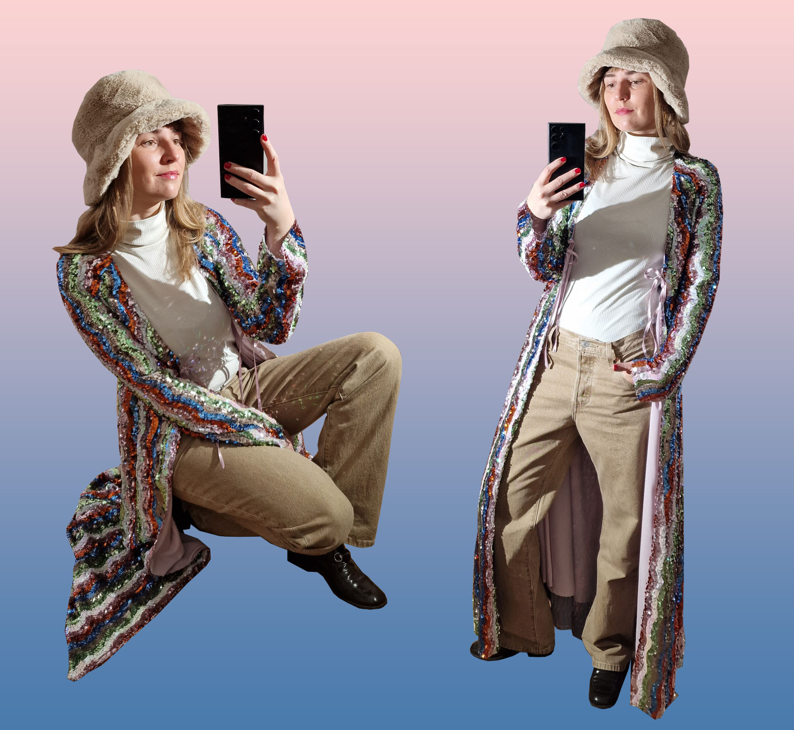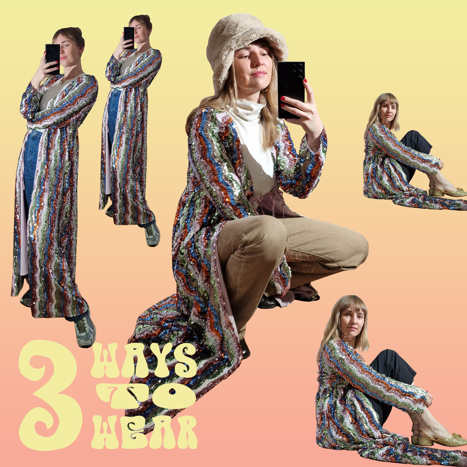 Es muss an all den negativen Dingen liegen, die durch die Welt, das Netz und das Radio jagen. An den schweren Zeiten, die uns hierzulande vergleichsweise noch mehr als milde treffen. An dieser nicht enden wollenden Pandemie, an den dunklen Tagen und nicht zuletzt auch an schönen Dingen wie der anstehenden Weihnachtszeit: Aber mir steht der Sinn voll und ganz nach Glitzer und Opulenz, nach Perlen und Pailletten, Schimmer und mehr, statt weniger. Und so traf die Zusammenarbeit zwischen unserem langjährigen Partner Edited und der grandiosen Pernille Rosenkilde nicht bloß einen Nerv bei mir, sie landete auch direkt in meinem Herzen. Und zwar mit ihrem funkelnden Regenbogenmantel aus zig Pailletten, den wir wahlweise als Kleid oder Mantel ausführen können, ganz einfach (!) in unserem Alltag tragen sollten oder selbstverständlich wie eine laufende Glitzerkugel bei Nacht.