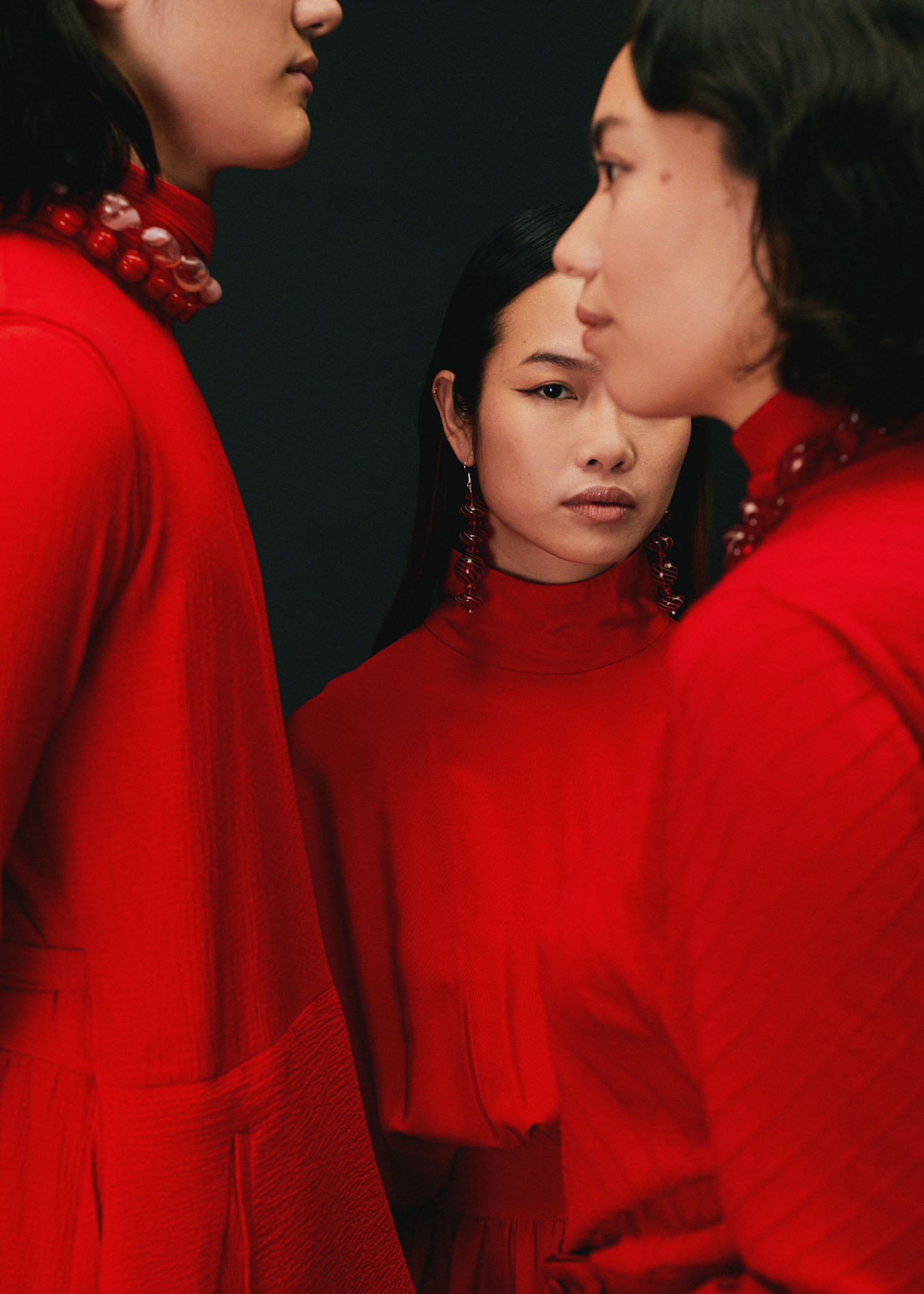 Die Kollektion wird, wie schon der Raum, in dem präsentiert wird, von einem kräftigen Rotton bestimmt und greift traditionelle asiatische Designelemente auf, die mit der klassischen WILLIAM FAN Stilistik fusioniert werden. Brokatstoffe in roten und roséfarbenen Tönen sind mit ihren goldenen Details eine dominante Komponente der neuen Saison. Die (Un-)Farben Schwarz, Braun und Creme ergänzen die roten Designs und deuten dabei auf persönliche Erinnerungen aus Williams Kindheit an die zuhause gelebte chinesische Kultur. Die Mandarinkrägen und der klassische Cheongsam Kleidschnitt aus Strick greifen ein weiteres Charakteristikum des chinesischen Designs auf. Oberteile aus Seide und bedruckte Seidenschals, mit dem sich alle zwölf Jahre wiederholenden chinesischen Tierkreis, sind weitere, markante Referenzen um das chinesische Fest auch gebührend zu feiern.