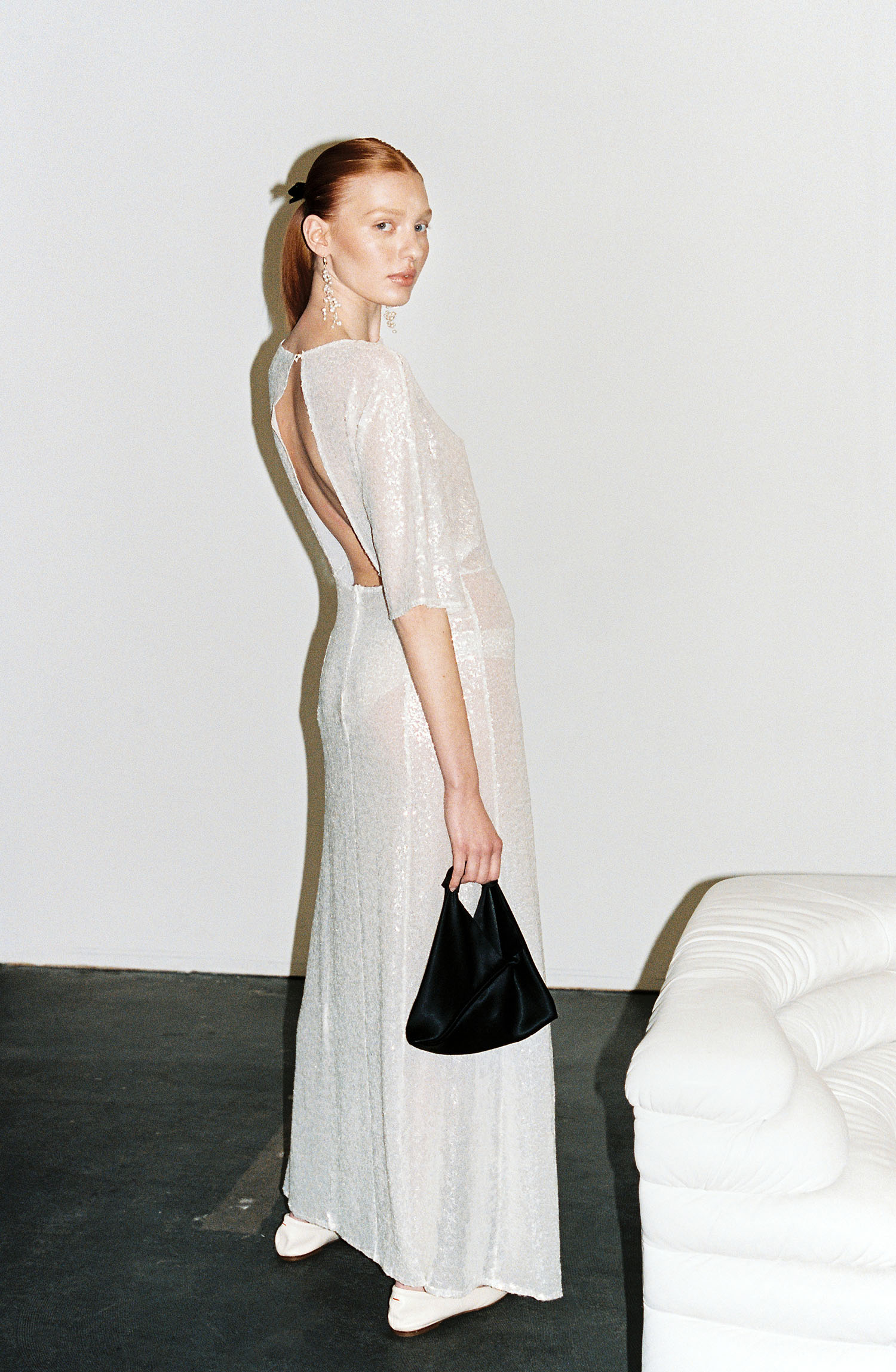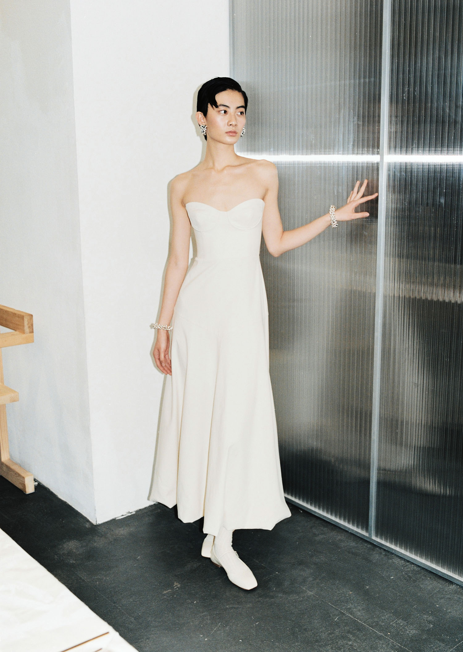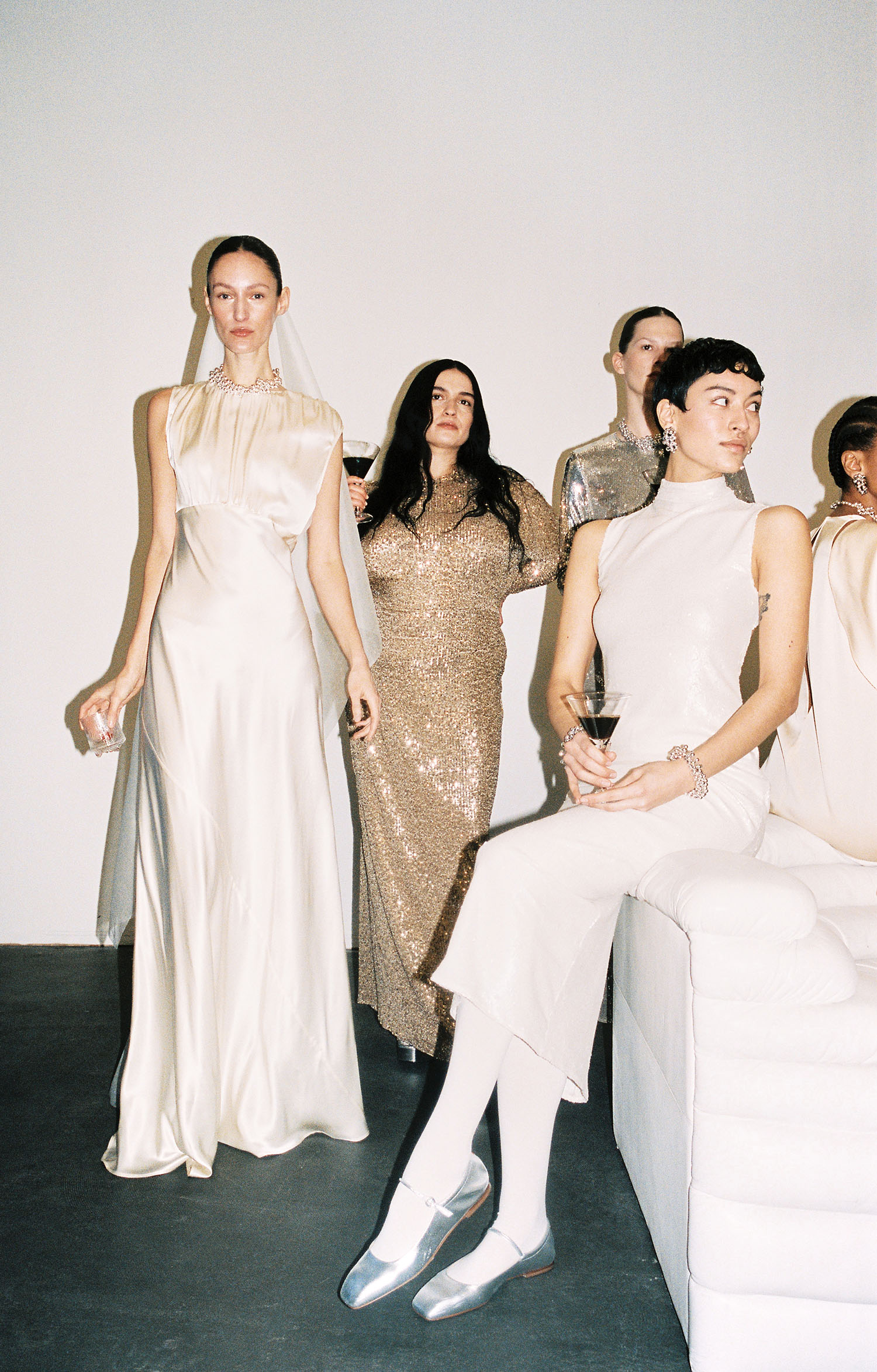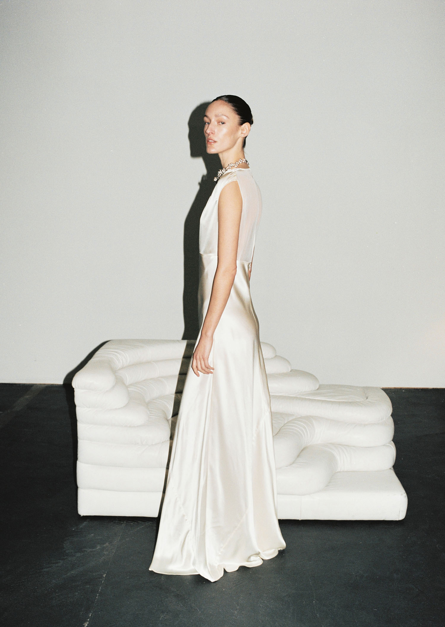 Die (allererste) Bridal Capsule entstand also auf Malaikas persönlicher Reise für ihre eigene Hochzeit und den maßgeschneiderten Brautkleidern, die sie für ganz besondere Kund*innen im Jahr 2022 entwickelte. Malaika wollte einen Brautlook kreieren, der eher schlicht, anmutig und minimalistisch ist, statt überladen romantisch. Und dennoch sollte er zart, feminin und selbstbestimmt sein: Die erste Bridal Linie versteht sich als Hommage an ikonische „Old Hollywood“-Hochzeiten und den Geist der wilden 20er Jahre in Berlin – übersetzt in einen eleganten, aber zeitgenössischen Vibe. Die Kollektionen werden aus nachhaltigen Fasern, recycelten Stoffen und Restbeständen aus unserem eigenen Archiv hergestellt oder von der Plattform ihres Partners Nona Source bezogen. Die Farbpalette der recycelten Seide, dem leichtem Baumwoll-Canvas und der Anzugwolle reicht von Creme über Elfenbein und Vanille bis hin zu strahlendem Weiß und wird durch Pailletten in verschiedenen Vintage-Tönen von Silber und Gold ergänzt. Der Schmuck dazu wurde gehäkelt und wurde aus Glasperlen, Perlen und Perlen aus recyceltem Gold und Silber gefertigt.