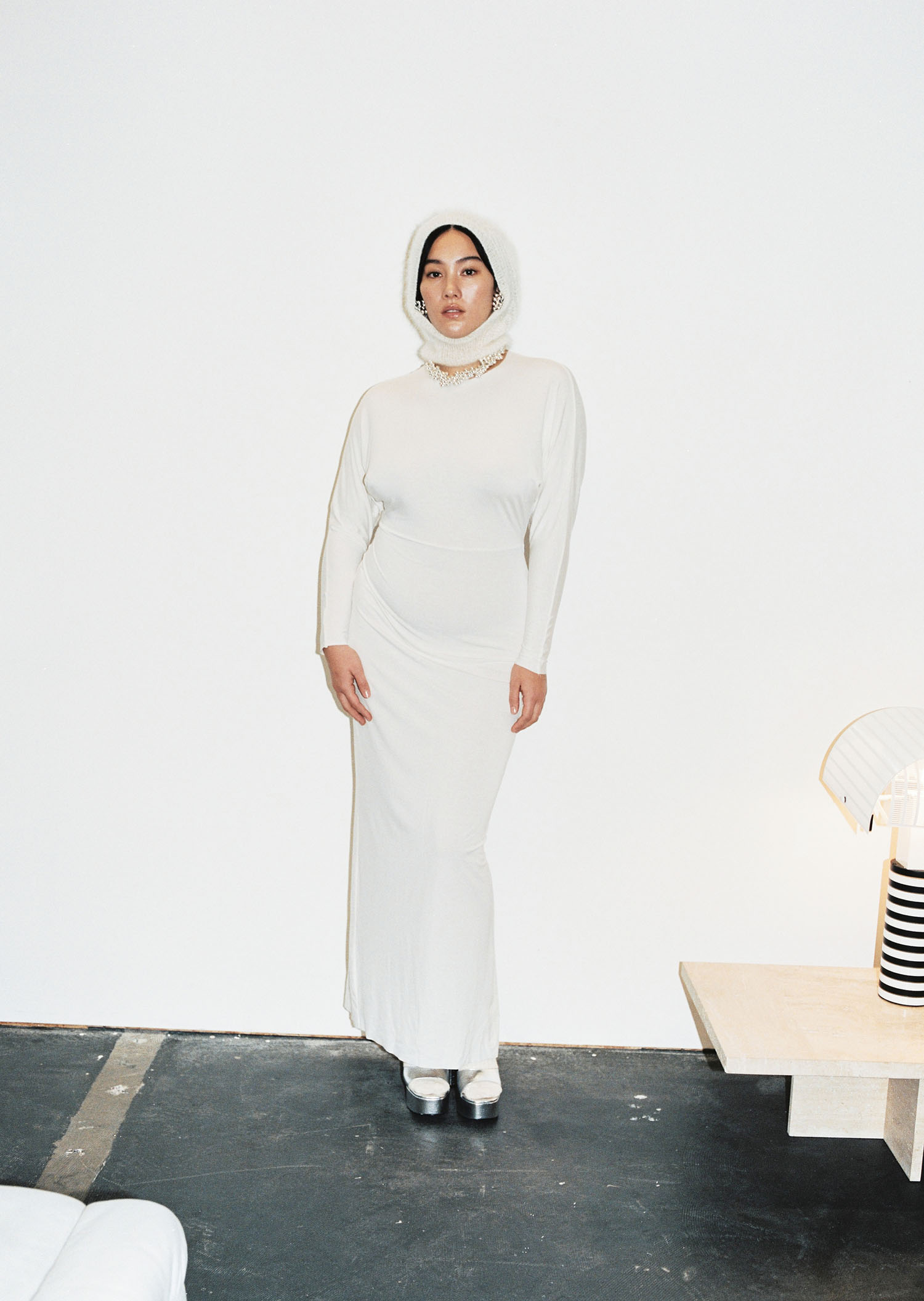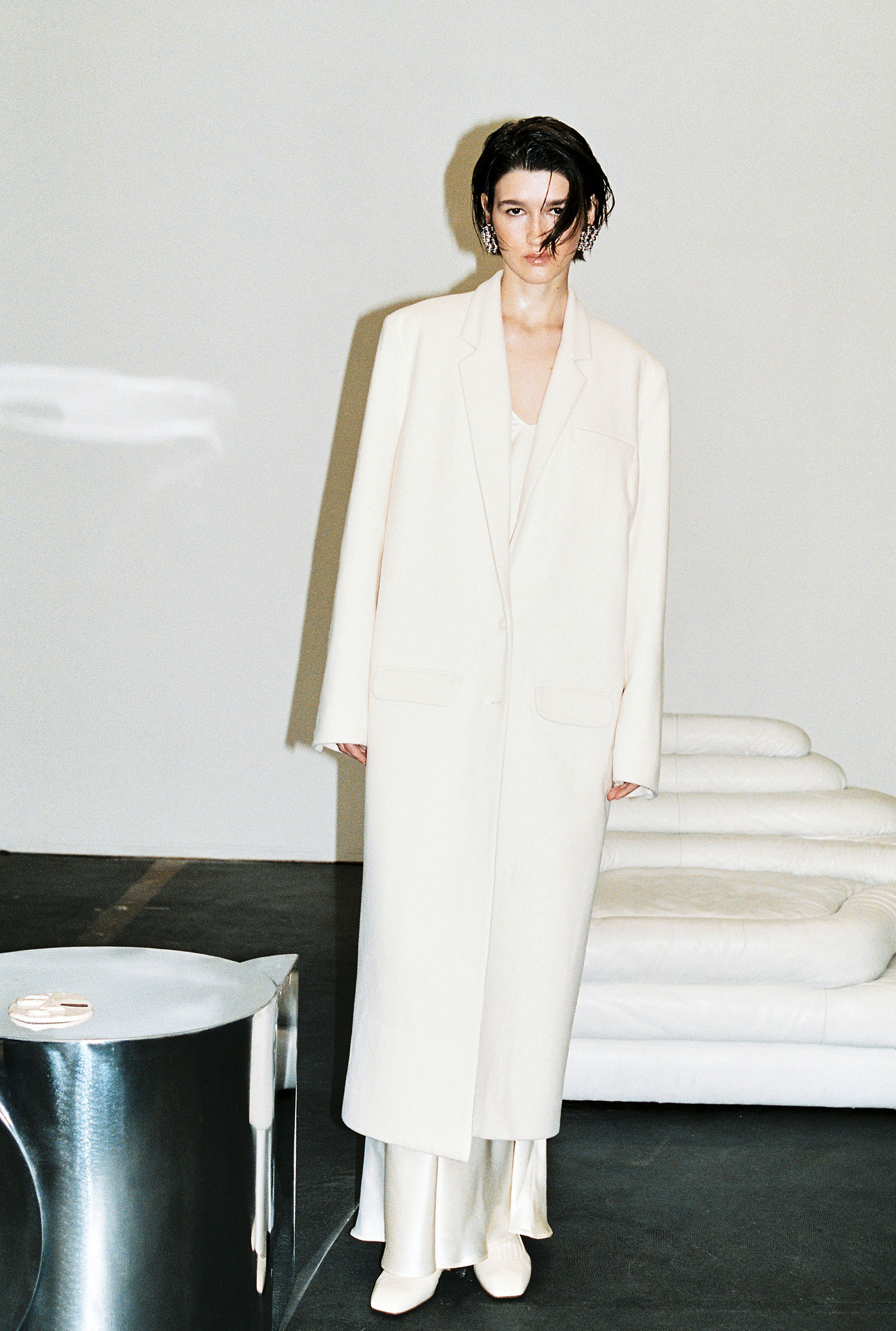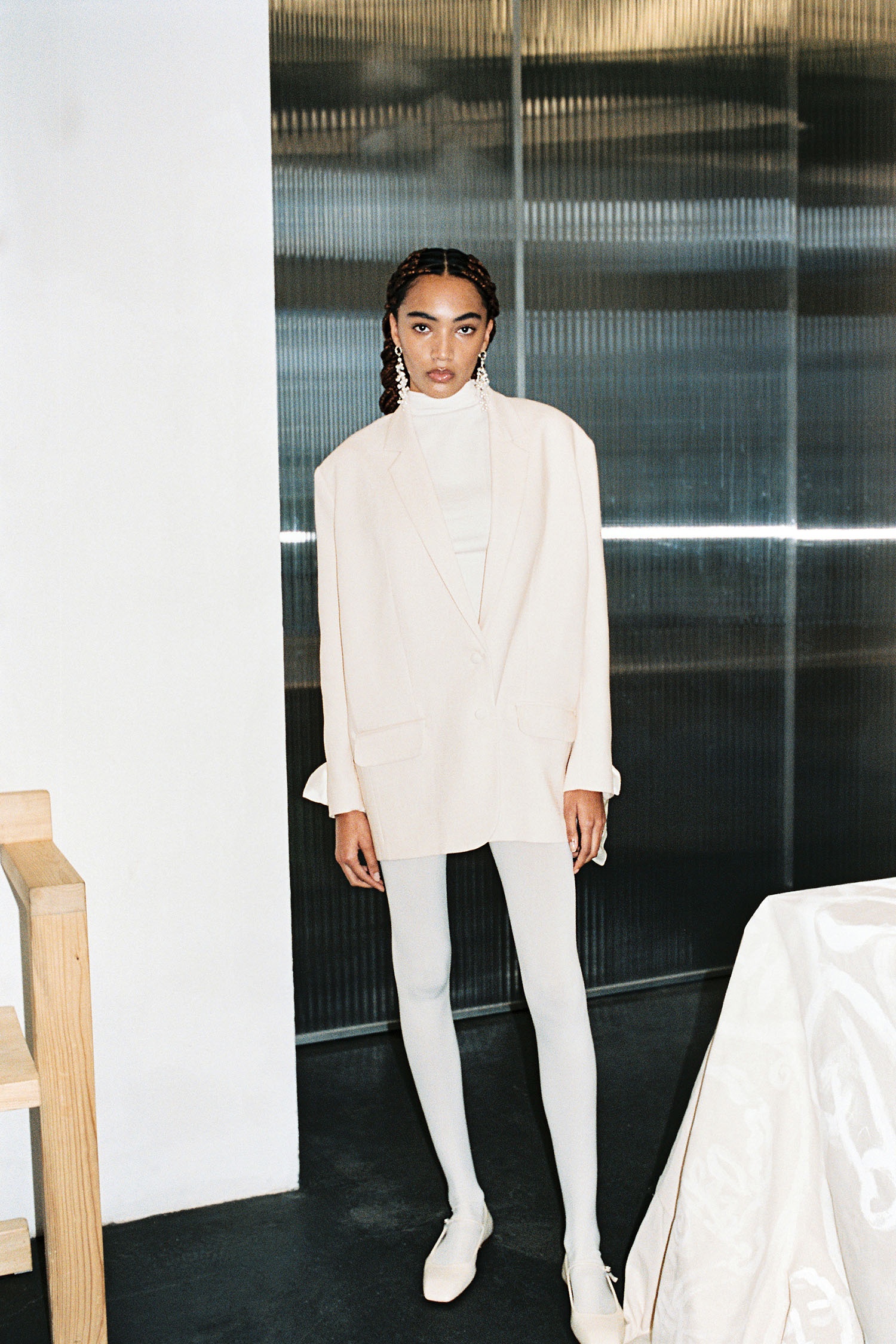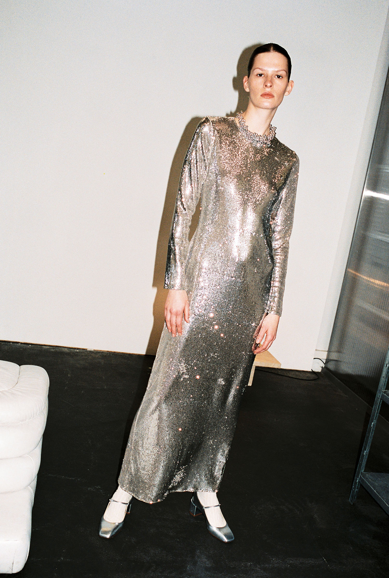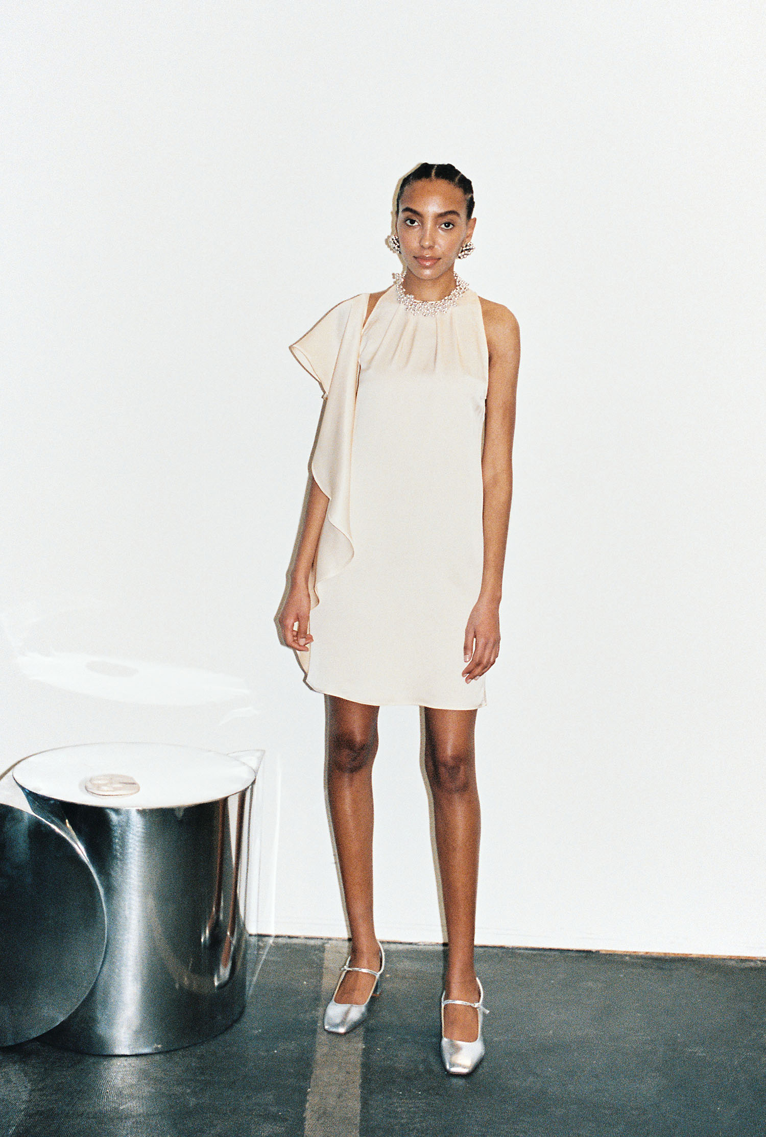 Die (allererste) Bridal Capsule entstand also auf Malaikas persönlicher Reise für ihre eigene Hochzeit und den maßgeschneiderten Brautkleidern, die sie für ganz besondere Kund*innen im Jahr 2022 entwickelte. Malaika wollte einen Brautlook kreieren, der eher schlicht, anmutig und minimalistisch ist, statt überladen romantisch. Und dennoch sollte er zart, feminin und selbstbestimmt sein: Die erste Bridal Linie versteht sich als Hommage an ikonische „Old Hollywood“-Hochzeiten und den Geist der wilden 20er Jahre in Berlin – übersetzt in einen eleganten, aber zeitgenössischen Vibe. Die Kollektionen werden aus nachhaltigen Fasern, recycelten Stoffen und Restbeständen aus unserem eigenen Archiv hergestellt oder von der Plattform ihres Partners Nona Source bezogen. Die Farbpalette der recycelten Seide, dem leichtem Baumwoll-Canvas und der Anzugwolle reicht von Creme über Elfenbein und Vanille bis hin zu strahlendem Weiß und wird durch Pailletten in verschiedenen Vintage-Tönen von Silber und Gold ergänzt. Der Schmuck dazu wurde gehäkelt und wurde aus Glasperlen, Perlen und Perlen aus recyceltem Gold und Silber gefertigt.
