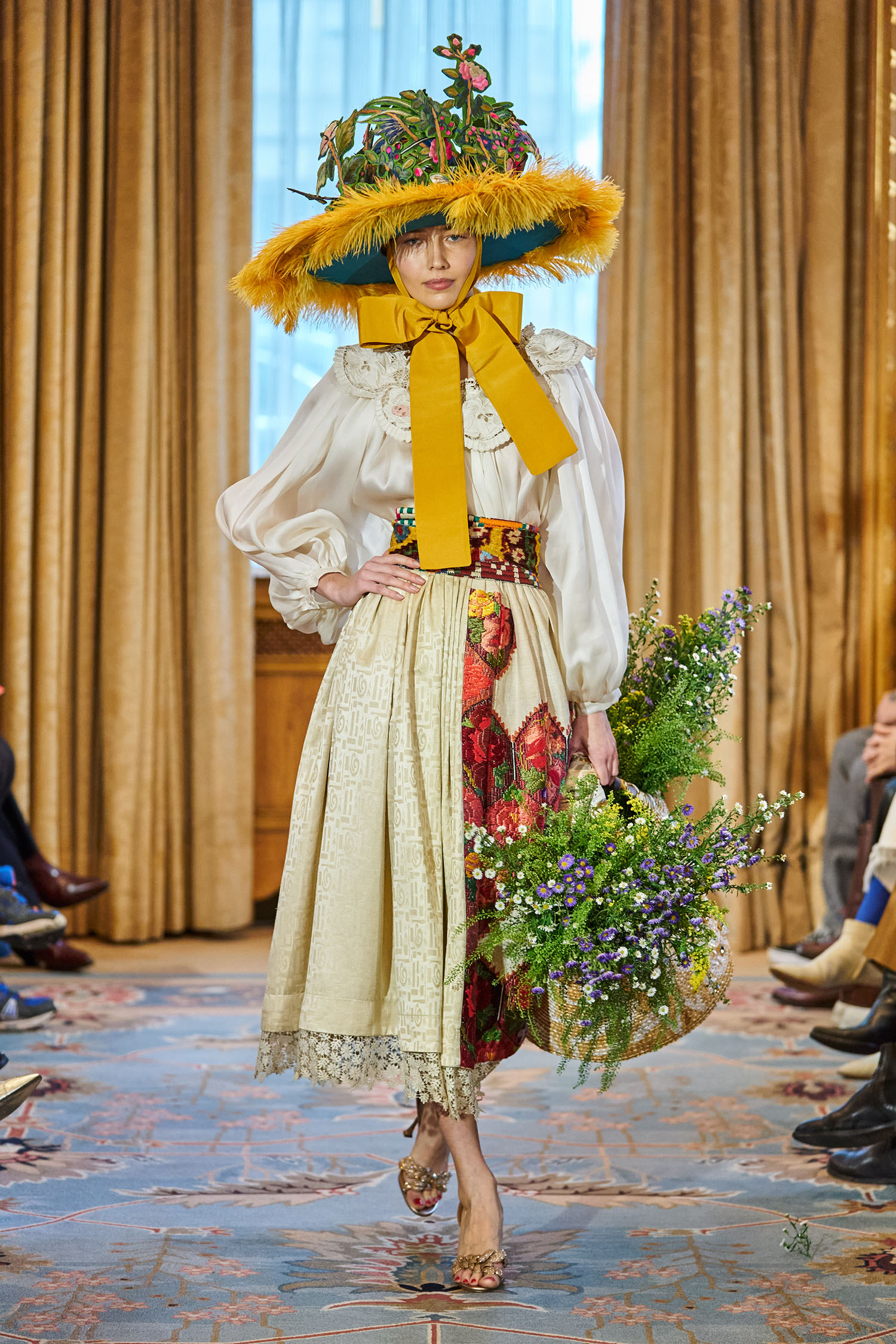 Große Hüte wurden mit voluminösen, geschichteten Looks gepaart und zeigten eindeutig die detailreiche Handwerkskunst von RIANNA + NINA. Maximalismus wurde zelebriert, durch paradiesischen, femininen Couture Charme und abgerundet durch handgewebte, bemalte Körbe, aus denen traumhafte Blumengestecke herausragten.