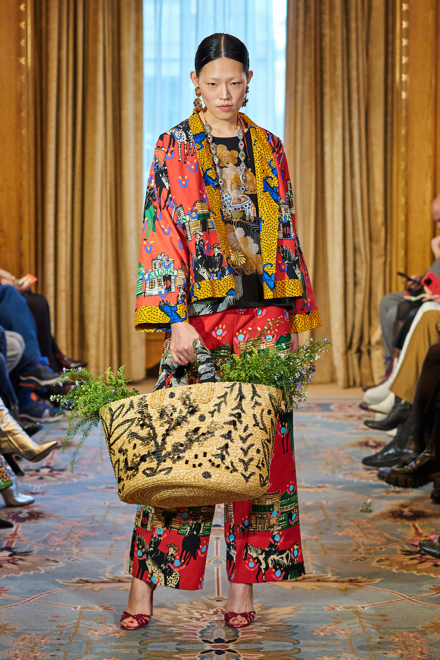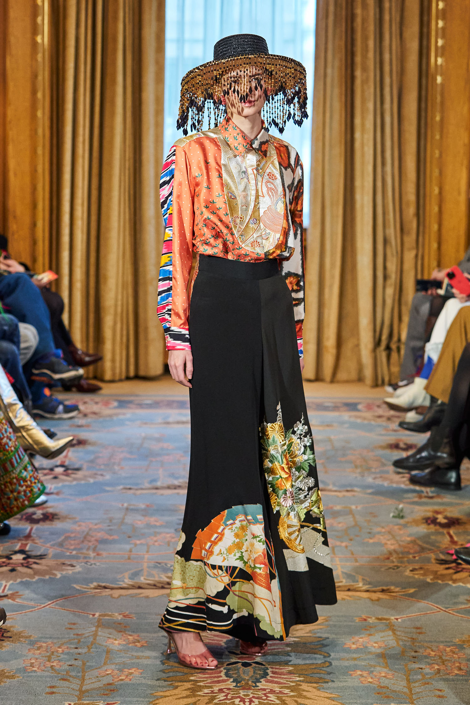 In einem der vielen Looks präsentierte RIANNA + NINA eine Bluse aus Seidenorganza mit Richelieu-Seidenspitze aus Frankreich. Eine handgestickte rumänische Schürze aus dem frühen 20. Jahrhundert wurde als Rock neu interpretiert und mit einem Seidenjacquard aus den 60er und 70er Jahren kombiniert, den die Marke in der griechischen Stadt Soufli gefunden hat. Das Statement Piece – ein Strohhut – wurde in Griechenland nach Familientradition handgefertigt und nicht nur mit antiken Ausschnitten aus chinesischer Stickerei aus dem 19. Jahrhundert dekoriert, sondern kam einer 3D-Garteninstallation aus Schmetterlingen, Vögeln, Blumen und Bäumen gleich. Außerdem wurde der Look mit einem handgewebten Korb mit einem Griff aus zwei Vintageschals gepaart und mit handbemalten und Upcycling-Swarovski-Kristallen bestickten Archiv- und Ikatstoffen ausgekleidet.