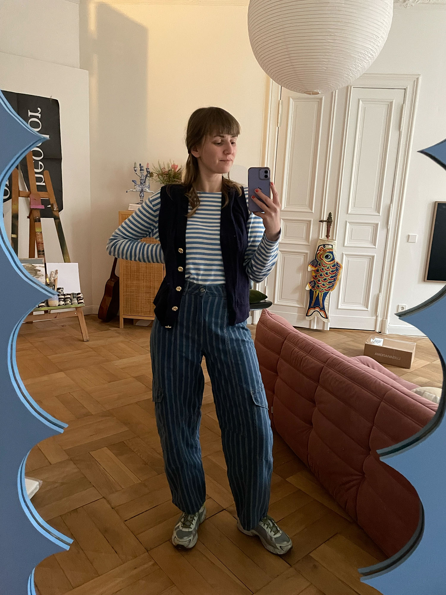 Ehrlicherweise trug ich über Wochen nur diese eine Kombi aus dunkelblauem Sweater und dunkelblauer Jeans. Ich legte die Sachen abends beiseite, sprang in meinen Pyjama und schlüpfte am nächsten Tag nach der Dusche einfach wieder hinein. Zugegeben, zwischendurch flogen die Sachen natürlich auch noch mal in die Wäsche und wurden gegen ähnlich gemütliche Teile ausgetauscht, viel Varianz gönnte ich mir jedoch nicht und irgendwann schlich sich ein gleichgültiges Gefühl ein. Also nutzte ich die vergangenen Sonnenstrahlen, um endlich mal wieder in die Gänge zu kommen und mich mal wieder den Kleidungsstücken zu widmen, die solch ein trauriges Leben in den dunklen Weiten meines Kleiderschranks verbrachten. Ich fand überraschende und doch dezente Streifenkombis, einen Cardigan mit Rosenapplikationen, den ich längst vergaß, ein älteres Paar Loafer, das dringend zum Schuster sollte und kuschelte in dem wohl gemütlichsten Zweiteiler der Welt.