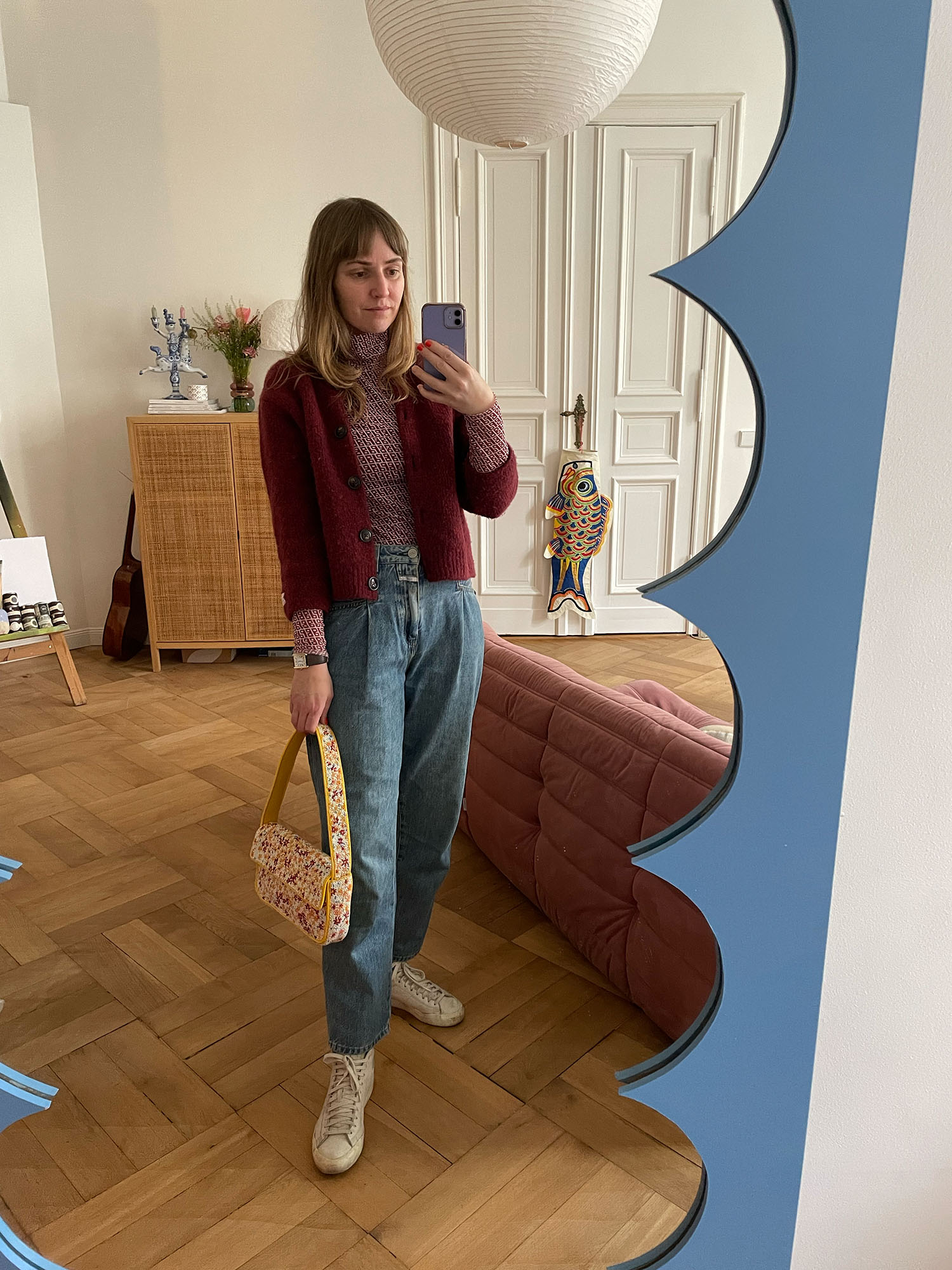 Cardigan: Closed, Shirt: Baum + Pferdgarten, Hose: Closed Pearl, Schuhe: adidas (ähnliche hier), Tasche: Staud |