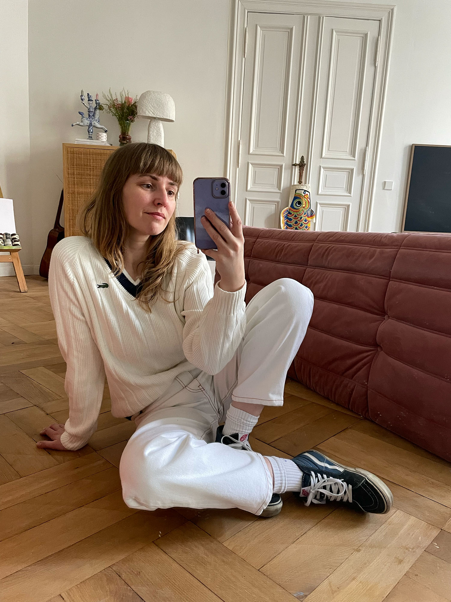 Pullover: Lacoste (alt), Jeans: Ganni, Schuhe: Vans |