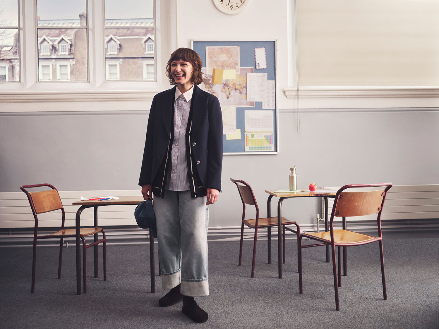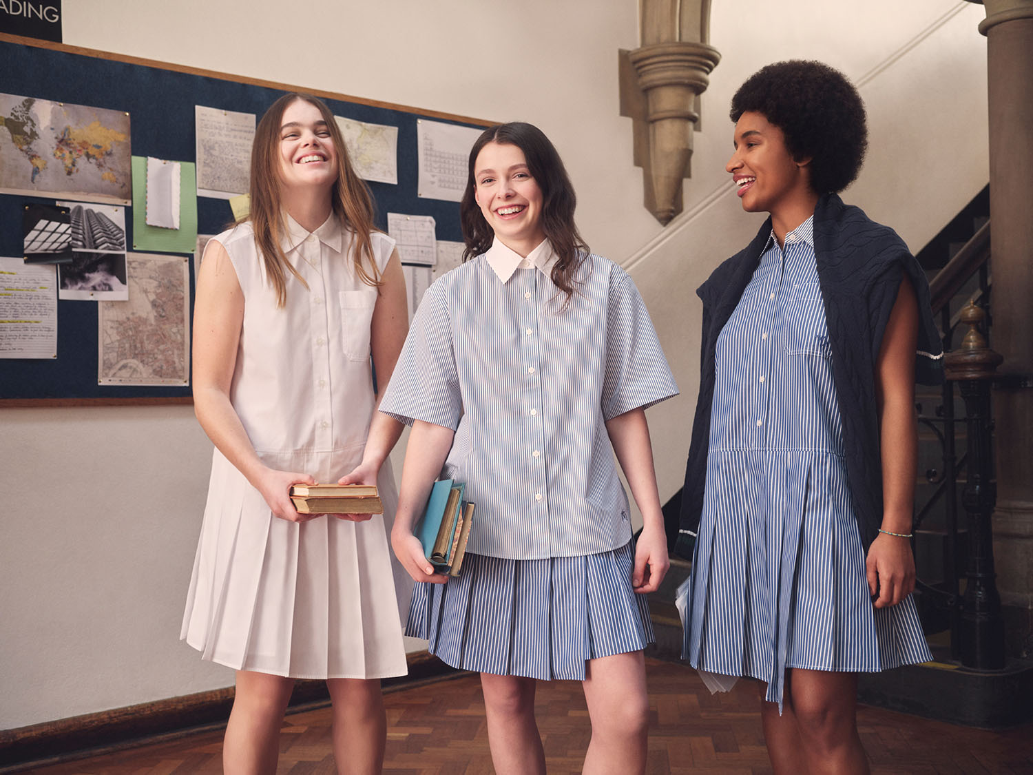 Back to School – oder eben auch: Back to Sports! Denn zig Kleidungsstücke lassen sich als funktionale Sportkleidung tragen. Dazu gehören ein vom Tennissport inspirierter Plisseerock, Leggings und Cropped BH-Tops aus dem weichen, schnelltrocknenden AIRism-Gewebe sowie ein Color Block Parka aus leichtem Nylon mit Farbblock-Design von JW ANDERSON.