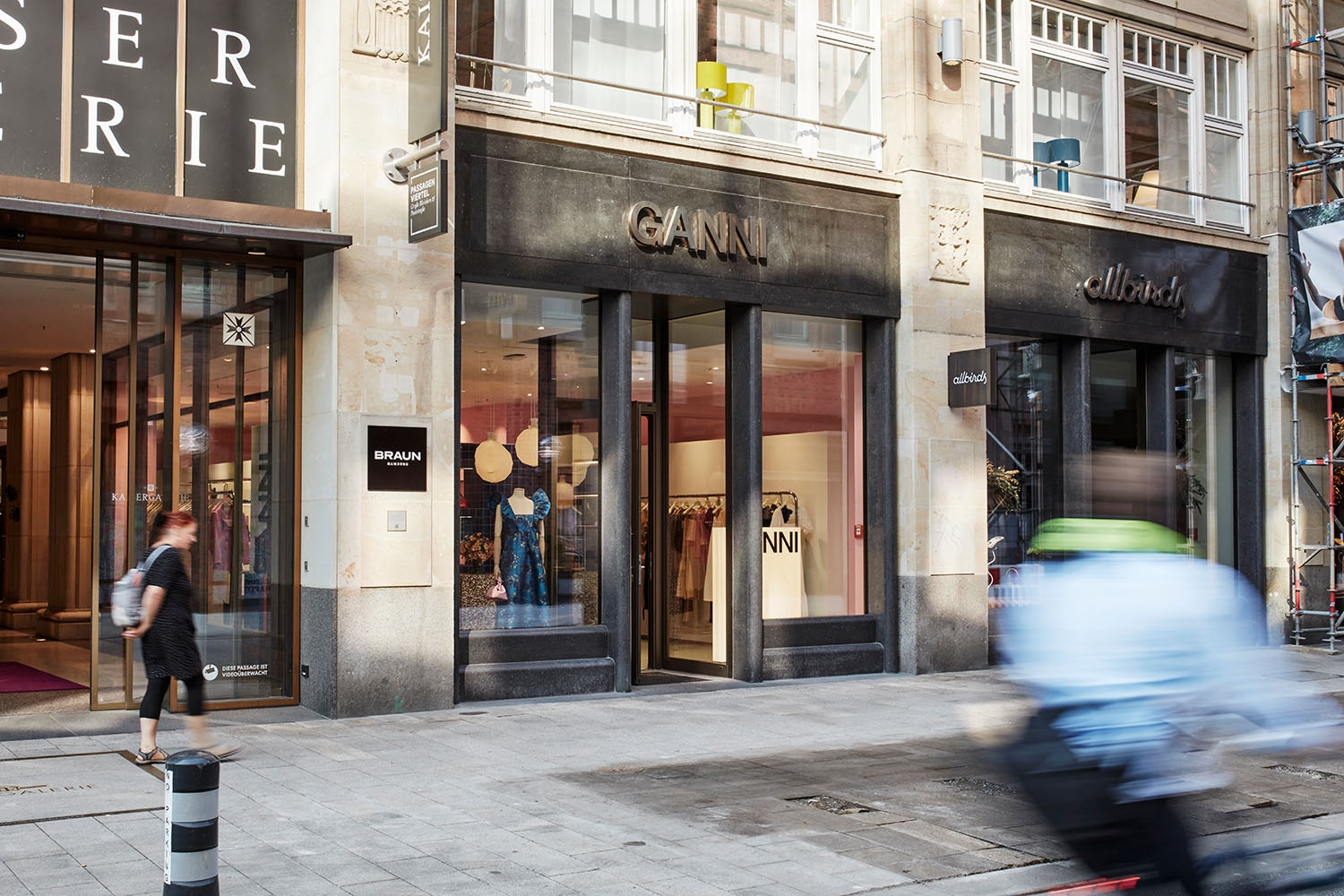 Huch, nanu! Die dänische Marke GANNI öffnet vergangene Woche ohne große Ankündigung die Türen ihres zweiten Flagshipstores in Deutschland und spannt seine Arme weiter Richtung Europa aus. Der brandneue Store befindet sich in einer der begehrtesten Einkaufsstraßen der Stadt, den Großen Bleichen. Für den Hamburger GANNI Store wurde eine Partnerschaft mit dem jungen Label und Kreativstudio Paul + Toni, gegründet von den Hamburgerinnen Paulina Wetzel und Antonia Rodriguez, bekanntgegeben: Zwei handgefertigte Kissen, gemacht aus GANNI Deadstock-Fabrics, zieren die Couch des neuen Stores. Und wir haben aus erster Hand erfahren, dass es eine kleine Version der Ganni Kissen noch im Laden zu kaufen gibt – und das sogar Aktionspreis!