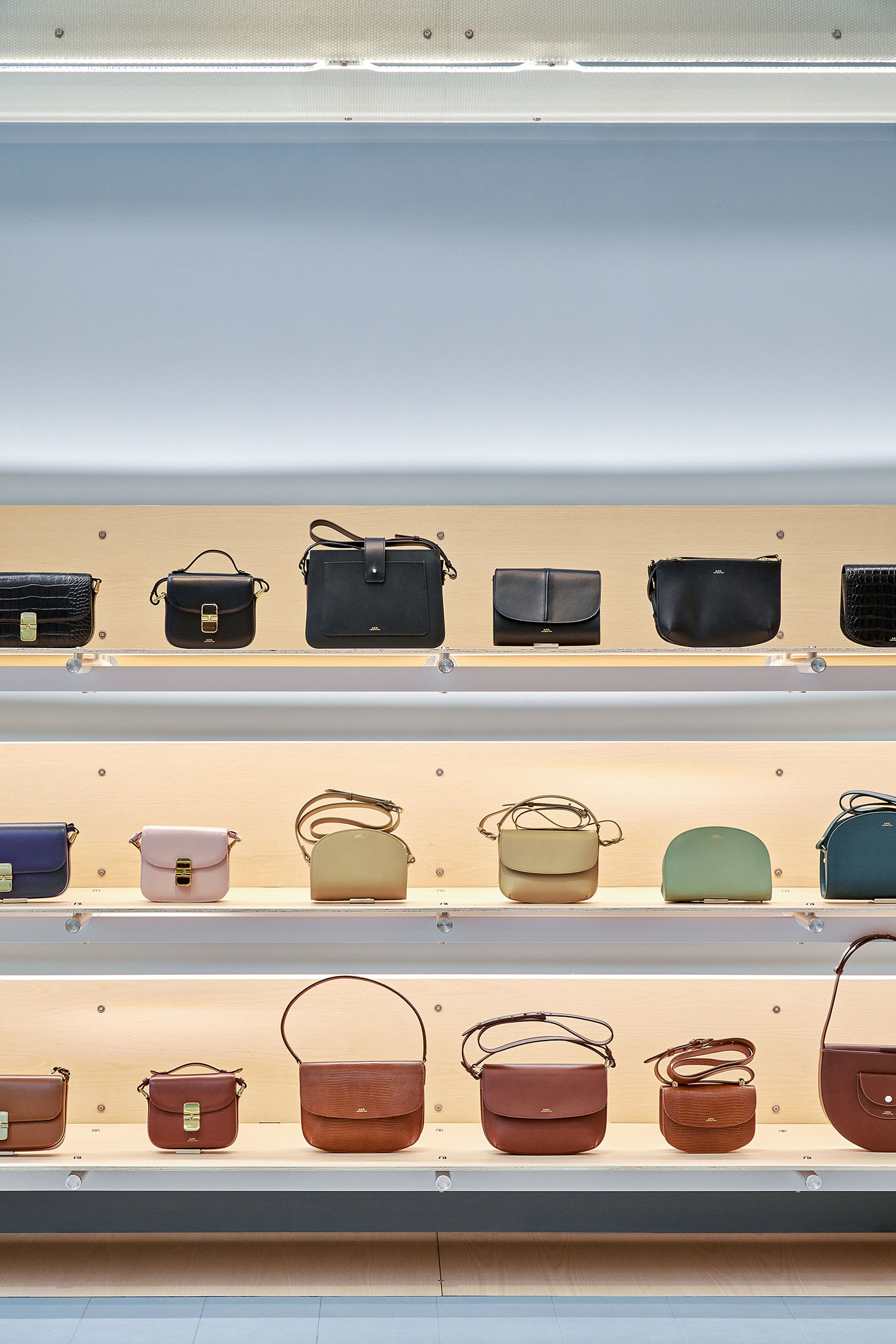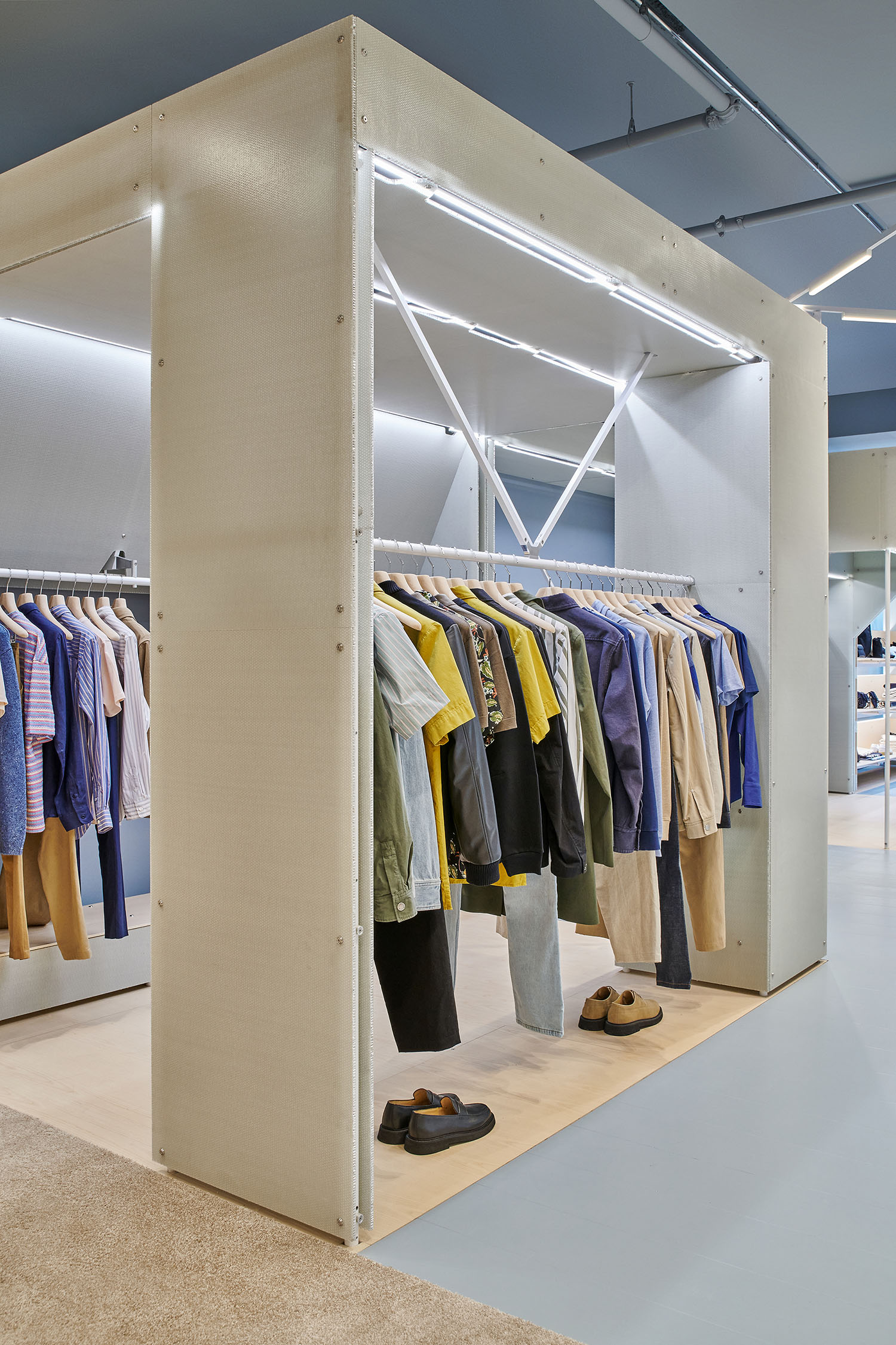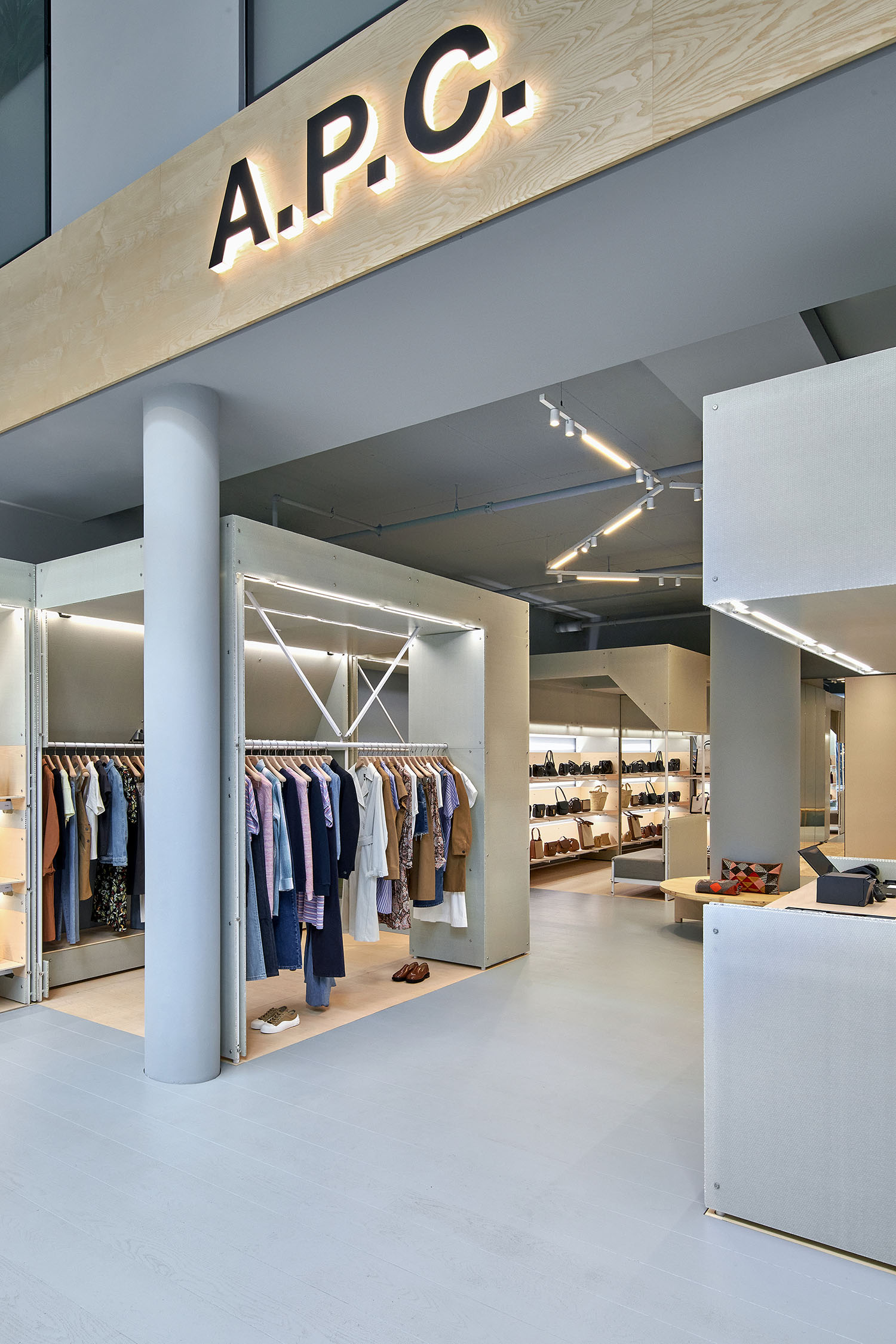 Anlässlich der Eröffnung der Boutique in Frankfurt haben A.P.C. und das Architekturstudio LaurentDeroo Architecte ein originelles, minimalistisches und cleveres, innenarchitektonisches Konzept entwickelt: Fünf Basismodule, vorgefertigt von der Pariser Werkstatt Panoramar, bilden den Raum, der sich auf das Wesentliche konzentrieren soll – „less is more“. Transluzente Wabenpaneele werden mit Esche-Furnier-Platten kombiniert und bilden gemeinsam außergewöhnliche volumetrische Einheiten und eine Art räumliches „Lego“. Das Interieur steht damit ganz im Einklang mit der Vision des Gründers: Für ihn zeichnet die Abwesenheit von Extravaganz die Garderobe von A.P.C. aus: Kleidung, die sich auf das Wesentliche konzentriert, sowohl schick als auch leicht zu tragen ist, mit hochwertigen Materialien und zeitlosen Schnitten.