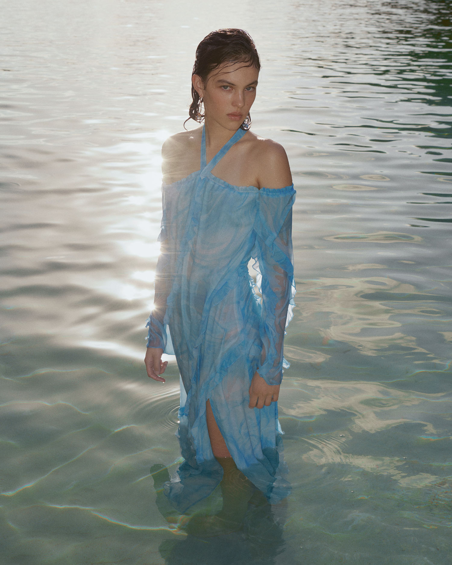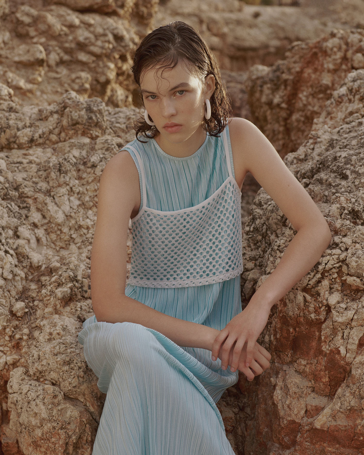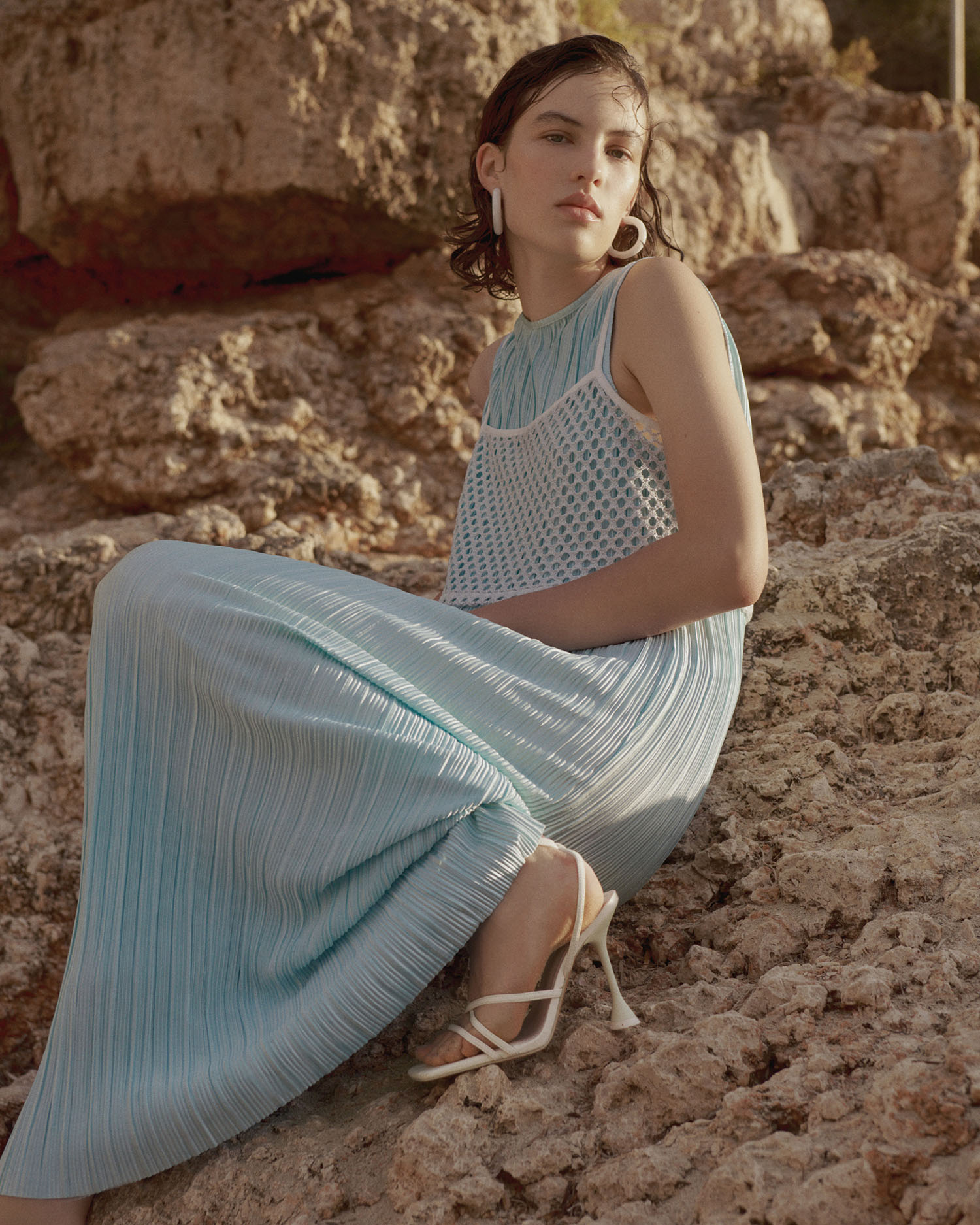 „Unser Trend für den Hochsommer ist eng mit den Fantasien der Meerjungfrauen verknüpft. In Kombinationen aus schwerelosen Sheers, sanft geschwungenen Silhouetten, schimmernden Optiken und verführerischen Ausschnitten kreiert „Deep Dive“ einen femininen, raffinierten und zugleich mysteriösen Look“, so Clarissa Labin, Creative Director von Edited. Und es geht sogar noch bunter: Denn die Palette reicht von erfrischenden Blau- und Türkistönen über pinke Akzente bis hin zu einem sonnigen Gelborange, die durch neutrale Töne ganz wunderbar abgerundet werden. Die Entwürfe setzen zudem auf ein Wechselspiel der Proportionen und mischen kurze Schnitte mit langen und verschiedensten Volumen. Das besondere Key-Piece ist definitiv die verlängerte Rocksilhouetten aus Makramee mitsamt des Pailletten-Besatzes. Aber auch der Rest besticht durch spannende Materialien und Details wie Mesh, Crochet, Muschel- und Perlmutt-Akzente sowie Texturen, die an funkelnde Fischschuppen erinnern. Mein Highlight neben dem metallisch schimmernden Bikini? Das Plisseekleid, ganz klar!