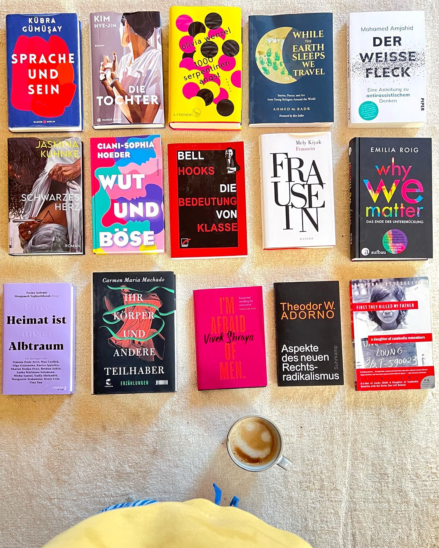 Und jetzt wieder ganz besonders, all diese Bücher (und noch viele, viele mehr) 1. Sprache und Sein – Kübra Gümüşay 2. Die Tochter – Kim Hye-Jin 3. 1000 Serpentinen Angst – Olivia Wenzel 4. While the earth sleeps we travel – Ahmed M. Badr 5. Der Weisse Fleck – Mohamed Amjahid 6. Schwarzes Herz – Jasmina Kuhnke 7. Wut und Böse – Ciani-Sophia Hoeder 8. Die Bedeutung von Klasse – Bell Hooks 9. Frausein – Mely Kiyak 10. Why We Matter – Emilia Roig 11. Heimat ist Albtraum – Fatma Aydemir + Hengameh Yaghoobifarah (Hrsg.) 12. Ihr Körper und andere Teilhaber – Carmen María Machado 13. I‘m afraid of men – Vivek Shraya 14. Aspekte des neuen Rechtsradikalismus – Theodor W. Adorno 15. First they killed my father – Loung Un